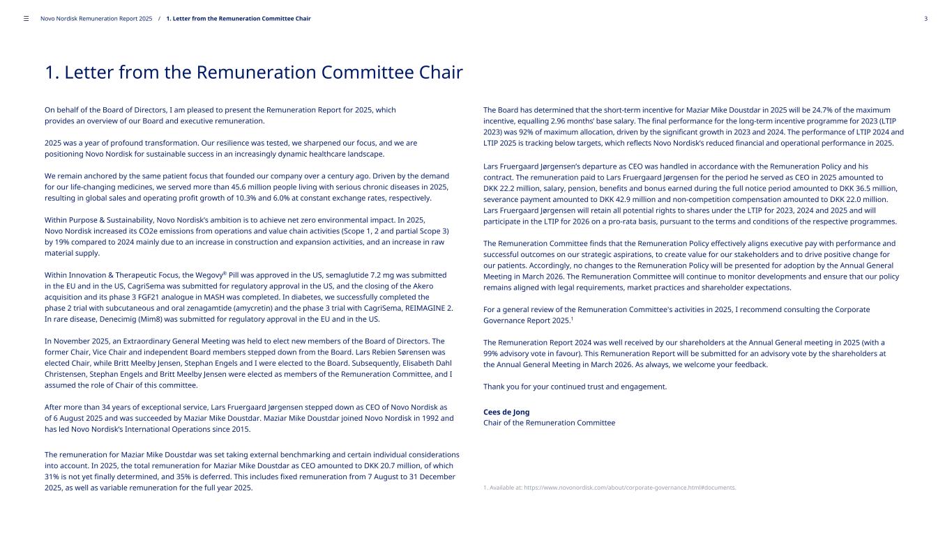 1. Letter from the Remuneration Committee Chair On behalf of the Board of Directors, I am pleased to present the Remuneration Report for 2025, which provides an overview of our Board and executive remuneration. 2025 was a year of profound transformation. Our resilience was tested, we sharpened our focus, and we are positioning Novo Nordisk for sustainable success in an increasingly dynamic healthcare landscape. We remain anchored by the same patient focus that founded our company over a century ago. Driven by the demand for our life-changing medicines, we served more than 45.6 million people living with serious chronic diseases in 2025, resulting in global sales and operating profit growth of 10.3% and 6.0% at constant exchange rates, respectively. Within Purpose & Sustainability, Novo Nordisk’s ambition is to achieve net zero environmental impact. In 2025, Novo Nordisk increased its CO2e emissions from operations and value chain activities (Scope 1, 2 and partial Scope 3) by 19% compared to 2024 mainly due to an increase in construction and expansion activities, and an increase in raw material supply. Within Innovation & Therapeutic Focus, the Wegovy® Pill was approved in the US, semaglutide 7.2 mg was submitted in the EU and in the US, CagriSema was submitted for regulatory approval in the US, and the closing of the Akero acquisition and its phase 3 FGF21 analogue in MASH was completed. In diabetes, we successfully completed the phase 2 trial with subcutaneous and oral zenagamtide (amycretin) and the phase 3 trial with CagriSema, REIMAGINE 2. In rare disease, Denecimig (Mim8) was submitted for regulatory approval in the EU and in the US. In November 2025, an Extraordinary General Meeting was held to elect new members of the Board of Directors. The former Chair, Vice Chair and independent Board members stepped down from the Board. Lars Rebien Sørensen was elected Chair, while Britt Meelby Jensen, Stephan Engels and I were elected to the Board. Subsequently, Elisabeth Dahl Christensen, Stephan Engels and Britt Meelby Jensen were elected as members of the Remuneration Committee, and I assumed the role of Chair of this committee. After more than 34 years of exceptional service, Lars Fruergaard Jørgensen stepped down as CEO of Novo Nordisk as of 6 August 2025 and was succeeded by Maziar Mike Doustdar. Maziar Mike Doustdar joined Novo Nordisk in 1992 and has led Novo Nordisk’s International Operations since 2015. The remuneration for Maziar Mike Doustdar was set taking external benchmarking and certain individual considerations into account. In 2025, the total remuneration for Maziar Mike Doustdar as CEO amounted to DKK 20.7 million, of which 31% is not yet finally determined, and 35% is deferred. This includes fixed remuneration from 7 August to 31 December 2025, as well as variable remuneration for the full year 2025. The Board has determined that the short-term incentive for Maziar Mike Doustdar in 2025 will be 24.7% of the maximum incentive, equalling 2.96 months’ base salary. The final performance for the long-term incentive programme for 2023 (LTIP 2023) was 92% of maximum allocation, driven by the significant growth in 2023 and 2024. The performance of LTIP 2024 and LTIP 2025 is tracking below targets, which reflects Novo Nordisk’s reduced financial and operational performance in 2025. Lars Fruergaard Jørgensen’s departure as CEO was handled in accordance with the Remuneration Policy and his contract. The remuneration paid to Lars Fruergaard Jørgensen for the period he served as CEO in 2025 amounted to DKK 22.2 million, salary, pension, benefits and bonus earned during the full notice period amounted to DKK 36.5 million, severance payment amounted to DKK 42.9 million and non-competition compensation amounted to DKK 22.0 million. Lars Fruergaard Jørgensen will retain all potential rights to shares under the LTIP for 2023, 2024 and 2025 and will participate in the LTIP for 2026 on a pro-rata basis, pursuant to the terms and conditions of the respective programmes. The Remuneration Committee finds that the Remuneration Policy effectively aligns executive pay with performance and successful outcomes on our strategic aspirations, to create value for our stakeholders and to drive positive change for our patients. Accordingly, no changes to the Remuneration Policy will be presented for adoption by the Annual General Meeting in March 2026. The Remuneration Committee will continue to monitor developments and ensure that our policy remains aligned with legal requirements, market practices and shareholder expectations. For a general review of the Remuneration Committee's activities in 2025, I recommend consulting the Corporate Governance Report 2025.1 The Remuneration Report 2024 was well received by our shareholders at the Annual General meeting in 2025 (with a 99% advisory vote in favour). This Remuneration Report will be submitted for an advisory vote by the shareholders at the Annual General Meeting in March 2026. As always, we welcome your feedback. Thank you for your continued trust and engagement. Cees de Jong Chair of the Remuneration Committee 1. Available at: https://www.novonordisk.com/about/corporate-governance.html#documents. ––– Novo Nordisk Remuneration Report 2025 / 1. Letter from the Remuneration Committee Chair 3