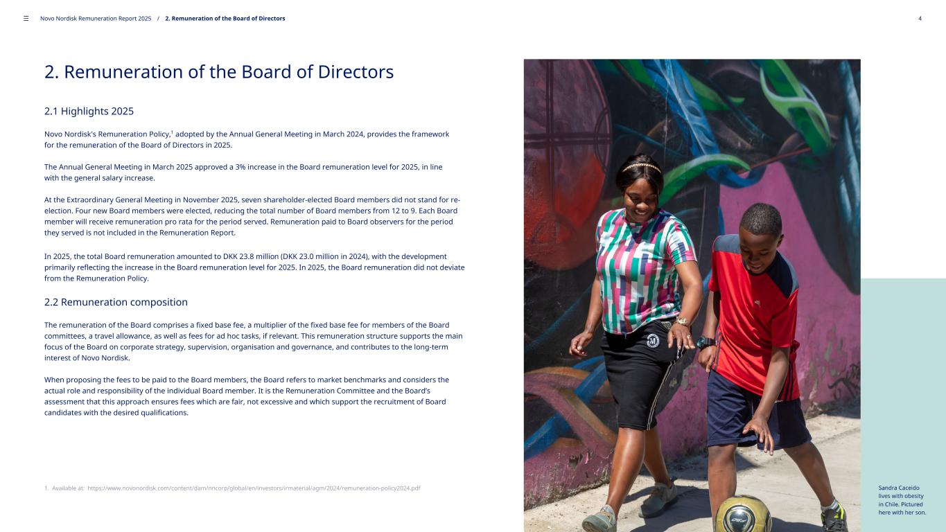 2. Remuneration of the Board of Directors 2.1 Highlights 2025 Novo Nordisk's Remuneration Policy,1 adopted by the Annual General Meeting in March 2024, provides the framework for the remuneration of the Board of Directors in 2025. The Annual General Meeting in March 2025 approved a 3% increase in the Board remuneration level for 2025, in line with the general salary increase. At the Extraordinary General Meeting in November 2025, seven shareholder-elected Board members did not stand for re- election. Four new Board members were elected, reducing the total number of Board members from 12 to 9. Each Board member will receive remuneration pro rata for the period served. Remuneration paid to Board observers for the period they served is not included in the Remuneration Report. In 2025, the total Board remuneration amounted to DKK 23.8 million (DKK 23.0 million in 2024), with the development primarily reflecting the increase in the Board remuneration level for 2025. In 2025, the Board remuneration did not deviate from the Remuneration Policy. 2.2 Remuneration composition The remuneration of the Board comprises a fixed base fee, a multiplier of the fixed base fee for members of the Board committees, a travel allowance, as well as fees for ad hoc tasks, if relevant. This remuneration structure supports the main focus of the Board on corporate strategy, supervision, organisation and governance, and contributes to the long-term interest of Novo Nordisk. When proposing the fees to be paid to the Board members, the Board refers to market benchmarks and considers the actual role and responsibility of the individual Board member. It is the Remuneration Committee and the Board’s assessment that this approach ensures fees which are fair, not excessive and which support the recruitment of Board candidates with the desired qualifications. 1. Available at: https://www.novonordisk.com/content/dam/nncorp/global/en/investors/irmaterial/agm/2024/remuneration-policy2024.pdf ––– Novo Nordisk Remuneration Report 2025 / 2. Remuneration of the Board of Directors 4