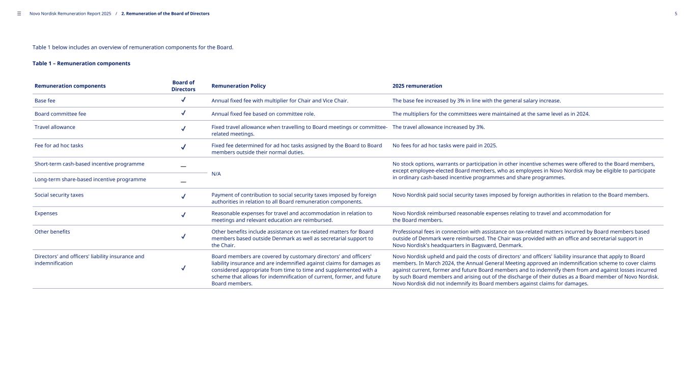 Table 1 below includes an overview of remuneration components for the Board. Table 1 – Remuneration components Remuneration components Board of Directors Remuneration Policy 2025 remuneration Base fee Annual fixed fee with multiplier for Chair and Vice Chair. The base fee increased by 3% in line with the general salary increase. Board committee fee Annual fixed fee based on committee role. The multipliers for the committees were maintained at the same level as in 2024. Travel allowance Fixed travel allowance when travelling to Board meetings or committee- related meetings. The travel allowance increased by 3%. Fee for ad hoc tasks Fixed fee determined for ad hoc tasks assigned by the Board to Board members outside their normal duties. No fees for ad hoc tasks were paid in 2025. Short-term cash-based incentive programme — N/A No stock options, warrants or participation in other incentive schemes were offered to the Board members, except employee-elected Board members, who as employees in Novo Nordisk may be eligible to participate in ordinary cash-based incentive programmes and share programmes.Long-term share-based incentive programme — Social security taxes Payment of contribution to social security taxes imposed by foreign authorities in relation to all Board remuneration components. Novo Nordisk paid social security taxes imposed by foreign authorities in relation to the Board members. Expenses Reasonable expenses for travel and accommodation in relation to meetings and relevant education are reimbursed. Novo Nordisk reimbursed reasonable expenses relating to travel and accommodation for the Board members. Other benefits Other benefits include assistance on tax-related matters for Board members based outside Denmark as well as secretarial support to the Chair. Professional fees in connection with assistance on tax-related matters incurred by Board members based outside of Denmark were reimbursed. The Chair was provided with an office and secretarial support in Novo Nordisk's headquarters in Bagsværd, Denmark. Directors' and officers' liability insurance and indemnification Board members are covered by customary directors' and officers' liability insurance and are indemnified against claims for damages as considered appropriate from time to time and supplemented with a scheme that allows for indemnification of current, former, and future Board members. Novo Nordisk upheld and paid the costs of directors' and officers' liability insurance that apply to Board members. In March 2024, the Annual General Meeting approved an indemnification scheme to cover claims against current, former and future Board members and to indemnify them from and against losses incurred by such Board members and arising out of the discharge of their duties as a Board member of Novo Nordisk. Novo Nordisk did not indemnify its Board members against claims for damages. ––– Novo Nordisk Remuneration Report 2025 / 2. Remuneration of the Board of Directors 5