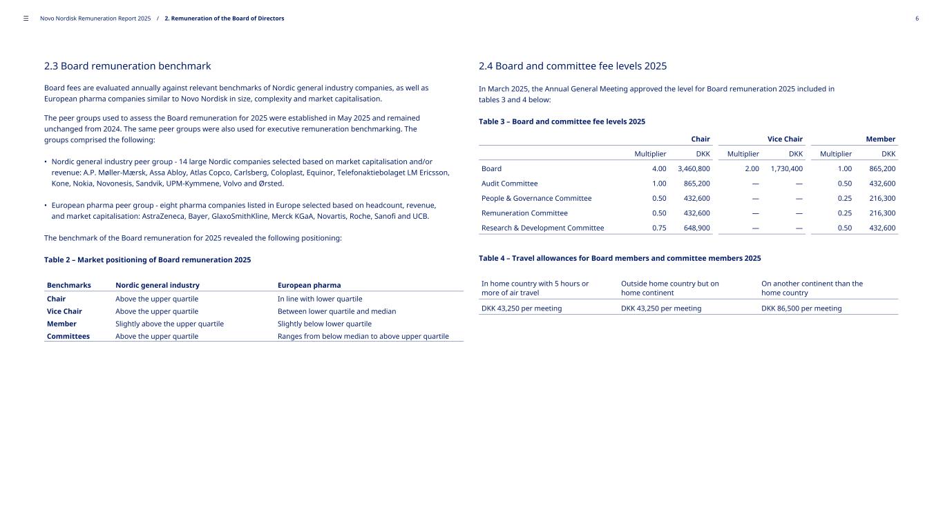 2.3 Board remuneration benchmark Board fees are evaluated annually against relevant benchmarks of Nordic general industry companies, as well as European pharma companies similar to Novo Nordisk in size, complexity and market capitalisation. The peer groups used to assess the Board remuneration for 2025 were established in May 2025 and remained unchanged from 2024. The same peer groups were also used for executive remuneration benchmarking. The groups comprised the following: • Nordic general industry peer group - 14 large Nordic companies selected based on market capitalisation and/or revenue: A.P. Møller-Mærsk, Assa Abloy, Atlas Copco, Carlsberg, Coloplast, Equinor, Telefonaktiebolaget LM Ericsson, Kone, Nokia, Novonesis, Sandvik, UPM-Kymmene, Volvo and Ørsted. • European pharma peer group - eight pharma companies listed in Europe selected based on headcount, revenue, and market capitalisation: AstraZeneca, Bayer, GlaxoSmithKline, Merck KGaA, Novartis, Roche, Sanofi and UCB. The benchmark of the Board remuneration for 2025 revealed the following positioning: Table 2 – Market positioning of Board remuneration 2025 Benchmarks Nordic general industry European pharma Chair Above the upper quartile In line with lower quartile Vice Chair Above the upper quartile Between lower quartile and median Member Slightly above the upper quartile Slightly below lower quartile Committees Above the upper quartile Ranges from below median to above upper quartile 2.4 Board and committee fee levels 2025 In March 2025, the Annual General Meeting approved the level for Board remuneration 2025 included in tables 3 and 4 below: Table 3 – Board and committee fee levels 2025 Chair Vice Chair Member Multiplier DKK Multiplier DKK Multiplier DKK Board 4.00 3,460,800 2.00 1,730,400 1.00 865,200 Audit Committee 1.00 865,200 — — 0.50 432,600 People & Governance Committee 0.50 432,600 — — 0.25 216,300 Remuneration Committee 0.50 432,600 — — 0.25 216,300 Research & Development Committee 0.75 648,900 — — 0.50 432,600 Table 4 – Travel allowances for Board members and committee members 2025 In home country with 5 hours or more of air travel Outside home country but on home continent On another continent than the home country DKK 43,250 per meeting DKK 43,250 per meeting DKK 86,500 per meeting ––– Novo Nordisk Remuneration Report 2025 / 2. Remuneration of the Board of Directors 6