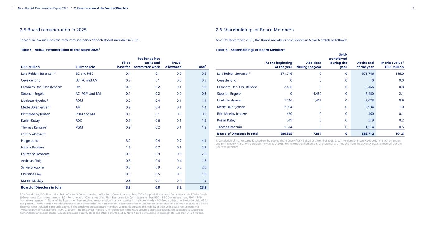 2.5 Board remuneration in 2025 Table 5 below includes the total remuneration of each Board member in 2025. Table 5 – Actual remuneration of the Board 20251 DKK million Current role Fixed base fee Fee for ad hoc tasks and committee work Travel allowance Total5 Lars Rebien Sørensen2,3 BC and PGC 0.4 0.1 0.0 0.5 Cees de Jong BV, RC and AM 0.2 0.1 0.0 0.3 Elisabeth Dahl Christensen4 RM 0.9 0.2 0.1 1.2 Stephan Engels AC, PGM and RM 0.1 0.2 0.0 0.3 Liselotte Hyveled4 RDM 0.9 0.4 0.1 1.4 Mette Bøjer Jensen4 AM 0.9 0.4 0.1 1.4 Britt Meelby Jensen RDM and RM 0.1 0.1 0.0 0.2 Kasim Kutay RDC 0.9 0.6 0.1 1.6 Thomas Rantzau4 PGM 0.9 0.2 0.1 1.2 Former Members: Helge Lund 3.0 0.4 0.7 4.1 Henrik Poulsen 1.5 0.7 0.1 2.3 Laurence Debroux 0.8 0.9 0.3 2.0 Andreas Fibig 0.8 0.4 0.4 1.6 Sylvie Grégoire 0.8 0.9 0.3 2.0 Christina Law 0.8 0.5 0.5 1.8 Martin Mackay 0.8 0.7 0.4 1.9 Board of Directors in total 13.8 6.8 3.2 23.8 BC = Board chair, BV = Board vice chair, AC = Audit Committee chair, AM = Audit Committee member, PGC = People & Governance Committee chair, PGM = People & Governance Committee member, RC = Remuneration Committee chair, RM = Remuneration Committee member, RDC = R&D Committee chair, RDM = R&D Committee member. 1. None of the Board members received remuneration from companies in the Novo Nordisk A/S Group other than Novo Nordisk A/S for this period. 2. Novo Nordisk provides secretarial assistance to the Chair in Denmark. 3. Remuneration to Lars Rebien Sørensen for the period he served as a Board observer is not included in the table above. 4. The employee-elected Board members voluntarily donated the majority of their 2025 Board remuneration to "Medarbejdernes Honorarfond i Novo Gruppen" (the Employees' Honorarium Foundation in the Novo Group), a charitable foundation dedicated to supporting humanitarian and social causes. 5. Excluding social security taxes and other benefits paid by Novo Nordisk amounting in aggregate to less than DKK 1 million. 2.6 Shareholdings of Board Members As of 31 December 2025, the Board members held shares in Novo Nordisk as follows: Table 6 – Shareholdings of Board Members At the beginning of the year Additions during the year Sold/ transferred during the year At the end of the year Market value1 DKK million Lars Rebien Sørensen2 571,746 0 0 571,746 186.0 Cees de Jong2 0 0 0 0 0.0 Elisabeth Dahl Christensen 2,466 0 0 2,466 0.8 Stephan Engels2 0 6,450 0 6,450 2.1 Liselotte Hyveled 1,216 1,407 0 2,623 0.9 Mette Bøjer Jensen 2,934 0 0 2,934 1.0 Britt Meelby Jensen2 460 0 0 460 0.1 Kasim Kutay 519 0 0 519 0.2 Thomas Rantzau 1,514 0 0 1,514 0.5 Board of Directors in total 580,855 7,857 0 588,712 191.6 1. Calculation of market value is based on the quoted share price of DKK 325.25 at the end of 2025. 2. Lars Rebien Sørensen, Cees de Jong, Stephan Engels and Britt Meelby Jensen were elected in November 2025. For new Board members, shareholdings are included from the day they became members of the Board of Directors. ––– Novo Nordisk Remuneration Report 2025 / 2. Remuneration of the Board of Directors 7