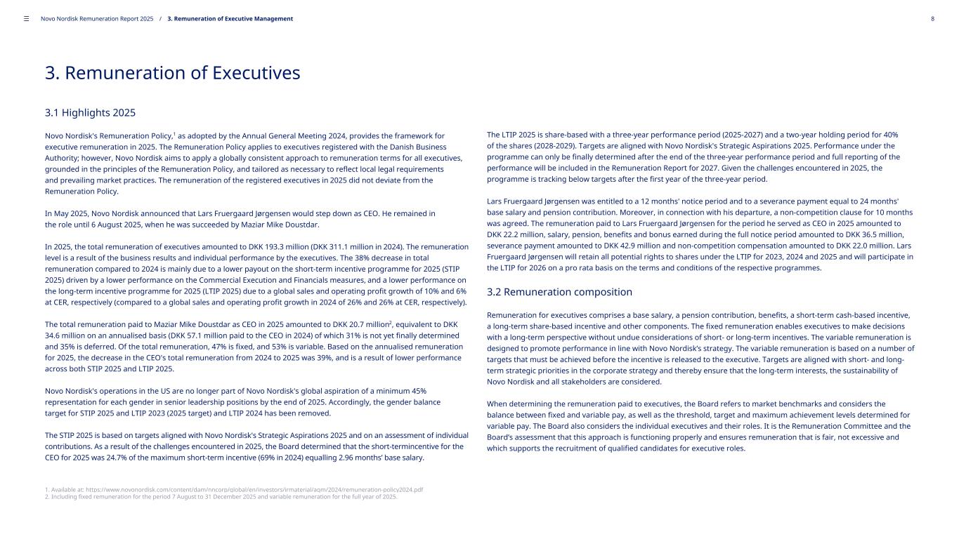 3. Remuneration of Executives 3.1 Highlights 2025 Novo Nordisk's Remuneration Policy,1 as adopted by the Annual General Meeting 2024, provides the framework for executive remuneration in 2025. The Remuneration Policy applies to executives registered with the Danish Business Authority; however, Novo Nordisk aims to apply a globally consistent approach to remuneration terms for all executives, grounded in the principles of the Remuneration Policy, and tailored as necessary to reflect local legal requirements and prevailing market practices. The remuneration of the registered executives in 2025 did not deviate from the Remuneration Policy. In May 2025, Novo Nordisk announced that Lars Fruergaard Jørgensen would step down as CEO. He remained in the role until 6 August 2025, when he was succeeded by Maziar Mike Doustdar. In 2025, the total remuneration of executives amounted to DKK 193.3 million (DKK 311.1 million in 2024). The remuneration level is a result of the business results and individual performance by the executives. The 38% decrease in total remuneration compared to 2024 is mainly due to a lower payout on the short-term incentive programme for 2025 (STIP 2025) driven by a lower performance on the Commercial Execution and Financials measures, and a lower performance on the long-term incentive programme for 2025 (LTIP 2025) due to a global sales and operating profit growth of 10% and 6% at CER, respectively (compared to a global sales and operating profit growth in 2024 of 26% and 26% at CER, respectively). The total remuneration paid to Maziar Mike Doustdar as CEO in 2025 amounted to DKK 20.7 million2, equivalent to DKK 34.6 million on an annualised basis (DKK 57.1 million paid to the CEO in 2024) of which 31% is not yet finally determined and 35% is deferred. Of the total remuneration, 47% is fixed, and 53% is variable. Based on the annualised remuneration for 2025, the decrease in the CEO's total remuneration from 2024 to 2025 was 39%, and is a result of lower performance across both STIP 2025 and LTIP 2025. Novo Nordisk's operations in the US are no longer part of Novo Nordisk's global aspiration of a minimum 45% representation for each gender in senior leadership positions by the end of 2025. Accordingly, the gender balance target for STIP 2025 and LTIP 2023 (2025 target) and LTIP 2024 has been removed. The STIP 2025 is based on targets aligned with Novo Nordisk's Strategic Aspirations 2025 and on an assessment of individual contributions. As a result of the challenges encountered in 2025, the Board determined that the short-termincentive for the CEO for 2025 was 24.7% of the maximum short-term incentive (69% in 2024) equalling 2.96 months’ base salary. 1. Available at: https://www.novonordisk.com/content/dam/nncorp/global/en/investors/irmaterial/agm/2024/remuneration-policy2024.pdf 2. Including fixed remuneration for the period 7 August to 31 December 2025 and variable remuneration for the full year of 2025. The LTIP 2025 is share-based with a three-year performance period (2025-2027) and a two-year holding period for 40% of the shares (2028-2029). Targets are aligned with Novo Nordisk's Strategic Aspirations 2025. Performance under the programme can only be finally determined after the end of the three-year performance period and full reporting of the performance will be included in the Remuneration Report for 2027. Given the challenges encountered in 2025, the programme is tracking below targets after the first year of the three-year period. Lars Fruergaard Jørgensen was entitled to a 12 months' notice period and to a severance payment equal to 24 months' base salary and pension contribution. Moreover, in connection with his departure, a non-competition clause for 10 months was agreed. The remuneration paid to Lars Fruergaard Jørgensen for the period he served as CEO in 2025 amounted to DKK 22.2 million, salary, pension, benefits and bonus earned during the full notice period amounted to DKK 36.5 million, severance payment amounted to DKK 42.9 million and non-competition compensation amounted to DKK 22.0 million. Lars Fruergaard Jørgensen will retain all potential rights to shares under the LTIP for 2023, 2024 and 2025 and will participate in the LTIP for 2026 on a pro rata basis on the terms and conditions of the respective programmes. 3.2 Remuneration composition Remuneration for executives comprises a base salary, a pension contribution, benefits, a short-term cash-based incentive, a long-term share-based incentive and other components. The fixed remuneration enables executives to make decisions with a long-term perspective without undue considerations of short- or long-term incentives. The variable remuneration is designed to promote performance in line with Novo Nordisk’s strategy. The variable remuneration is based on a number of targets that must be achieved before the incentive is released to the executive. Targets are aligned with short- and long- term strategic priorities in the corporate strategy and thereby ensure that the long-term interests, the sustainability of Novo Nordisk and all stakeholders are considered. When determining the remuneration paid to executives, the Board refers to market benchmarks and considers the balance between fixed and variable pay, as well as the threshold, target and maximum achievement levels determined for variable pay. The Board also considers the individual executives and their roles. It is the Remuneration Committee and the Board’s assessment that this approach is functioning properly and ensures remuneration that is fair, not excessive and which supports the recruitment of qualified candidates for executive roles. ––– Novo Nordisk Remuneration Report 2025 / 3. Remuneration of Executive Management 8