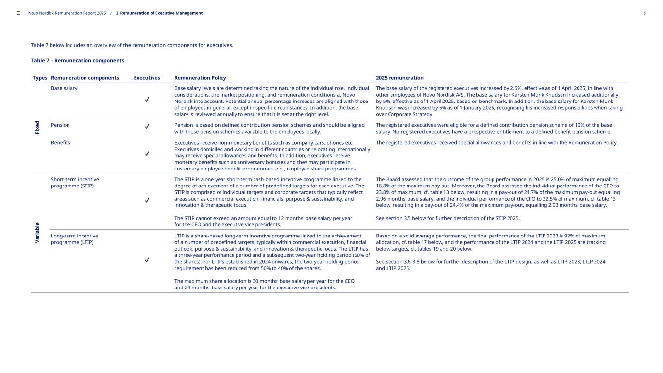 Table 7 below includes an overview of the remuneration components for executives. Table 7 – Remuneration components Types Remuneration components Executives Remuneration Policy 2025 remuneration Fi xe d Base salary Base salary levels are determined taking the nature of the individual role, individual considerations, the market positioning, and remuneration conditions at Novo Nordisk into account. Potential annual percentage increases are aligned with those of employees in general, except in specific circumstances. In addition, the base salary is reviewed annually to ensure that it is set at the right level. The base salary of the registered executives increased by 2.5%, effective as of 1 April 2025, in line with other employees of Novo Nordisk A/S. The base salary for Karsten Munk Knudsen increased additionally by 5%, effective as of 1 April 2025, based on benchmark. In addition, the base salary for Karsten Munk Knudsen was increased by 5% as of 1 January 2025, recognising his increased responsibilities when taking over Corporate Strategy. Pension Pension is based on defined contribution pension schemes and should be aligned with those pension schemes available to the employees locally. The registered executives were eligible for a defined contribution pension scheme of 10% of the base salary. No registered executives have a prospective entitlement to a defined benefit pension scheme. Benefits Executives receive non-monetary benefits such as company cars, phones etc. Executives domiciled and working in different countries or relocating internationally may receive special allowances and benefits. In addition, executives receive monetary benefits such as anniversary bonuses and they may participate in customary employee benefit programmes, e.g., employee share programmes. The registered executives received special allowances and benefits in line with the Remuneration Policy. Va ri ab le Short-term incentive programme (STIP) The STIP is a one-year short-term cash-based incentive programme linked to the degree of achievement of a number of predefined targets for each executive. The STIP is comprised of individual targets and corporate targets that typically reflect areas such as commercial execution, financials, purpose & sustainability, and innovation & therapeutic focus. The STIP cannot exceed an amount equal to 12 months' base salary per year for the CEO and the executive vice presidents. The Board assessed that the outcome of the group performance in 2025 is 25.0% of maximum equalling 18.8% of the maximum pay-out. Moreover, the Board assessed the individual performance of the CEO to 23.8% of maximum, cf. table 13 below, resulting in a pay-out of 24.7% of the maximum pay-out equalling 2.96 months’ base salary, and the individual performance of the CFO to 22.5% of maximum, cf. table 13 below, resulting in a pay-out of 24.4% of the maximum pay-out, equalling 2.93 months’ base salary. See section 3.5 below for further description of the STIP 2025. Long-term incentive programme (LTIP) LTIP is a share-based long-term incentive programme linked to the achievement of a number of predefined targets, typically within commercial execution, financial outlook, purpose & sustainability, and innovation & therapeutic focus. The LTIP has a three-year performance period and a subsequent two-year holding period (50% of the shares). For LTIPs established in 2024 onwards, the two-year holding period requirement has been reduced from 50% to 40% of the shares. The maximum share allocation is 30 months’ base salary per year for the CEO and 24 months’ base salary per year for the executive vice presidents. Based on a solid average performance, the final performance of the LTIP 2023 is 92% of maximum allocation, cf. table 17 below, and the performance of the LTIP 2024 and the LTIP 2025 are tracking below targets, cf. tables 19 and 20 below. See section 3.6-3.8 below for further description of the LTIP design, as well as LTIP 2023, LTIP 2024 and LTIP 2025. ––– Novo Nordisk Remuneration Report 2025 / 3. Remuneration of Executive Management 9