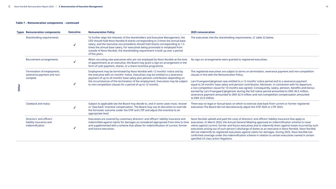 Table 7 – Remuneration components - continued Types Remuneration components Executive Remuneration Policy 2025 remuneration O th er Shareholding requirements To further align the interests of the shareholders and Executive Management, the CEO should hold Novo Nordisk B shares corresponding to 3 times the annual base salary, and the executive vice presidents should hold shares corresponding to 1.5 times the annual base salary. For executives being promoted or employed from outside of Novo Nordisk, the shareholding requirement is built up over a period of five years. The executives met the shareholding requirements, cf. table 22 below. Recruitment arrangements When recruiting new executives who are not employed by Novo Nordisk at the time of appointment as an executive, the Board may grant a sign-on arrangement in the form of cash payment, shares, or a share incentive programme. No sign-on arrangements were granted to registered executives. Termination of employment, severance payment and non- compete Employment may be terminated by Novo Nordisk with 12 months' notice and by the executive with six months' notice. Executives may be entitled to a severance payment of up to 24 months‘ base salary plus pension contribution depending on the circumstances of the termination of the employment. Executives may be subject to non-competition clauses for a period of up to 12 months. The registered executives are subject to terms on termination, severance payment and non-competition clauses in line with the Remuneration Policy. Lars Fruergaard Jørgensen was entitled to a 12 months' notice period and to a severance payment equal to 24 months' base salary and pension contribution. Moreover, in connection with his departure, a non-competition clause for 10 months was agreed. Consequently, salary, pension, benefits and bonus earned by Lars Fruergaard Jørgensen during the full notice period amounted to DKK 36.5 million, severance payment amounted to DKK 42.9 million and non-competition compensation amounted to DKK 22.0 million. Clawback and malus Subject to applicable law the Board may decide to, and in some cases must, recover or ‘claw-back’ incentive compensation. The Board may use its discretion to override the formulaic outcome under the STIP and LTIP and adjust the incentive to an appropriate level. There was no legal or factual basis on which to exercise claw-back from current or former registered executives The Board did not discretionarily adjust the STIP 2025 or LTIP 2025. Directors' and officers' liability insurance and indemnification Executives are covered by customary directors' and officers' liability insurance and indemnified against claims for damages as considered appropriate from time to time and supplemented with a scheme that allows for indemnification of current, former and future executives. Novo Nordisk upheld and paid the costs of directors’ and officers’ liability insurance that apply to executives. In March 2024, the Annual General Meeting approved an indemnification scheme to cover claims against current, former and future executives and to indemnify them against losses incurred by such executives arising out of such person's discharge of duties as an executive in Novo Nordisk. Novo Nordisk did not indemnify its registered executives against claims for damages. During 2025, Novo Nordisk has confirmed coverage under the indemnification scheme in relation to certain executives named in certain specified US class action litigations. ––– Novo Nordisk Remuneration Report 2025 / 3. Remuneration of Executive Management 10