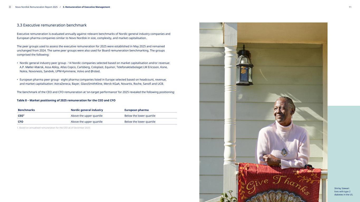 3.3 Executive remuneration benchmark Executive remuneration is evaluated annually against relevant benchmarks of Nordic general industry companies and European pharma companies similar to Novo Nordisk in size, complexity, and market capitalisation. The peer groups used to assess the executive remuneration for 2025 were established in May 2025 and remained unchanged from 2024. The same peer groups were also used for Board remuneration benchmarking. The groups comprised the following: • Nordic general industry peer group - 14 Nordic companies selected based on market capitalisation and/or revenue: A.P. Møller-Mærsk, Assa Abloy, Atlas Copco, Carlsberg, Coloplast, Equinor, Telefonaktiebolaget LM Ericsson, Kone, Nokia, Novonesis, Sandvik, UPM-Kymmene, Volvo and Ørsted. • European pharma peer group - eight pharma companies listed in Europe selected based on headcount, revenue, and market capitalisation: AstraZeneca, Bayer, GlaxoSmithKline, Merck KGaA, Novartis, Roche, Sanofi and UCB. The benchmark of the CEO and CFO remuneration at ‘on-target performance’ for 2025 revealed the following positioning: Table 8 – Market positioning of 2025 remuneration for the CEO and CFO Benchmarks Nordic general industry European pharma CEO1 Above the upper quartile Below the lower quartile CFO Above the upper quartile Below the lower quartile 1. Based on annualised remuneration for the CEO as of December 2025. ––– Novo Nordisk Remuneration Report 2025 / 3. Remuneration of Executive Management 11