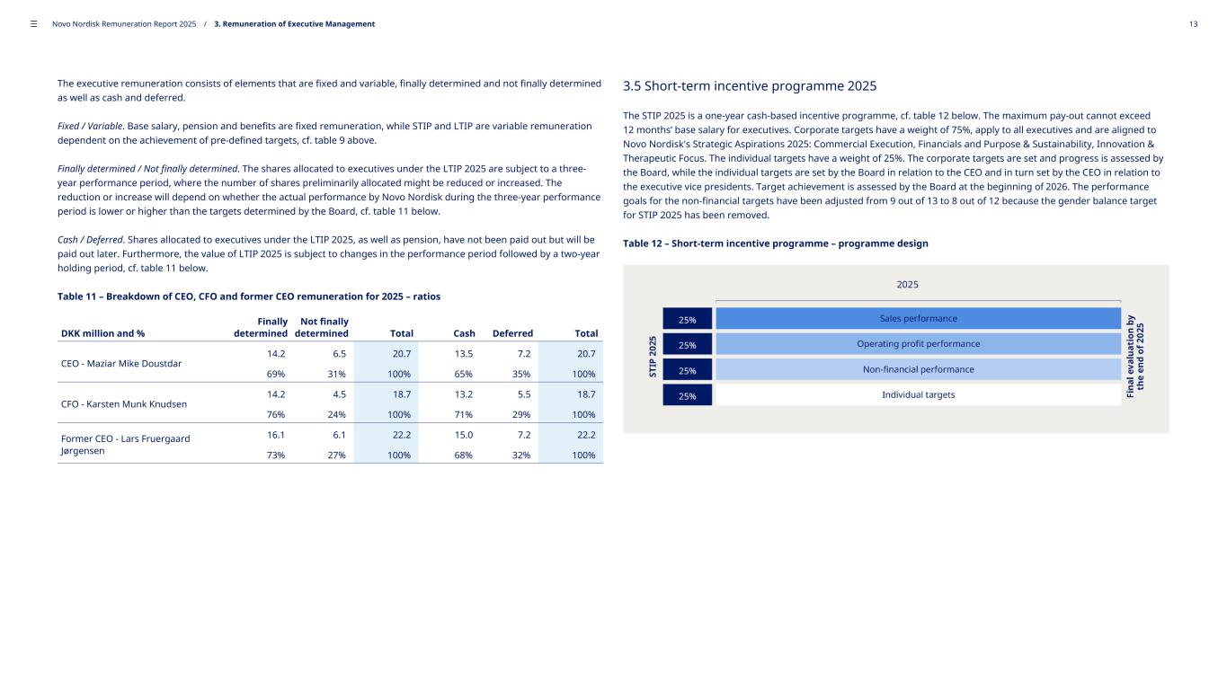 The executive remuneration consists of elements that are fixed and variable, finally determined and not finally determined as well as cash and deferred. Fixed / Variable. Base salary, pension and benefits are fixed remuneration, while STIP and LTIP are variable remuneration dependent on the achievement of pre-defined targets, cf. table 9 above. Finally determined / Not finally determined. The shares allocated to executives under the LTIP 2025 are subject to a three- year performance period, where the number of shares preliminarily allocated might be reduced or increased. The reduction or increase will depend on whether the actual performance by Novo Nordisk during the three-year performance period is lower or higher than the targets determined by the Board, cf. table 11 below. Cash / Deferred. Shares allocated to executives under the LTIP 2025, as well as pension, have not been paid out but will be paid out later. Furthermore, the value of LTIP 2025 is subject to changes in the performance period followed by a two-year holding period, cf. table 11 below. Table 11 – Breakdown of CEO, CFO and former CEO remuneration for 2025 – ratios DKK million and % Finally determined Not finally determined Total Cash Deferred Total CEO - Maziar Mike Doustdar 14.2 6.5 20.7 13.5 7.2 20.7 69% 31% 100% 65% 35% 100% CFO - Karsten Munk Knudsen 14.2 4.5 18.7 13.2 5.5 18.7 76% 24% 100% 71% 29% 100% Former CEO - Lars Fruergaard Jørgensen 16.1 6.1 22.2 15.0 7.2 22.2 73% 27% 100% 68% 32% 100% 3.5 Short-term incentive programme 2025 The STIP 2025 is a one-year cash-based incentive programme, cf. table 12 below. The maximum pay-out cannot exceed 12 months’ base salary for executives. Corporate targets have a weight of 75%, apply to all executives and are aligned to Novo Nordisk's Strategic Aspirations 2025: Commercial Execution, Financials and Purpose & Sustainability, Innovation & Therapeutic Focus. The individual targets have a weight of 25%. The corporate targets are set and progress is assessed by the Board, while the individual targets are set by the Board in relation to the CEO and in turn set by the CEO in relation to the executive vice presidents. Target achievement is assessed by the Board at the beginning of 2026. The performance goals for the non-financial targets have been adjusted from 9 out of 13 to 8 out of 12 because the gender balance target for STIP 2025 has been removed. Table 12 – Short-term incentive programme – programme design ––– Novo Nordisk Remuneration Report 2025 / 3. Remuneration of Executive Management 13