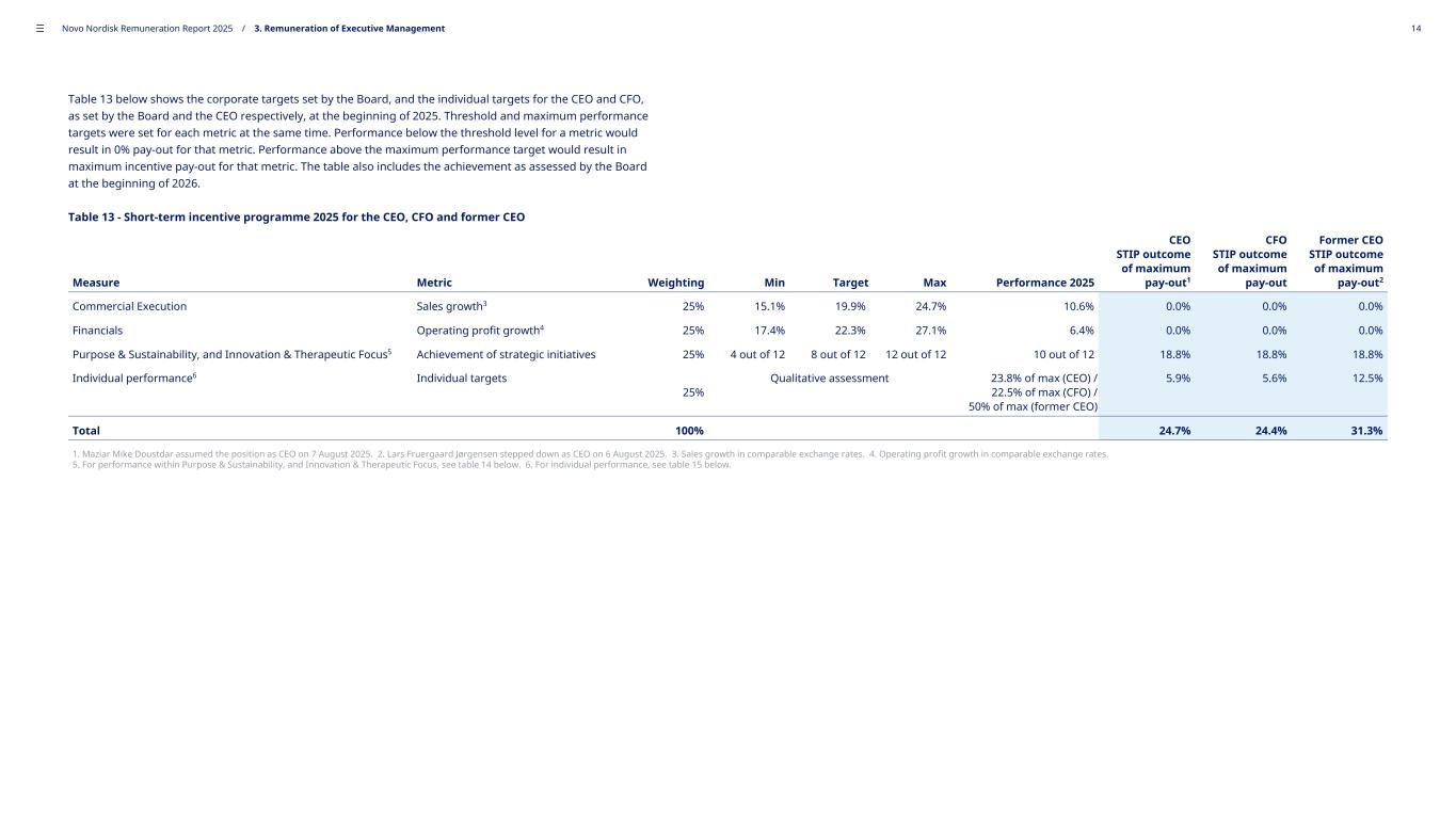 Table 13 below shows the corporate targets set by the Board, and the individual targets for the CEO and CFO, as set by the Board and the CEO respectively, at the beginning of 2025. Threshold and maximum performance targets were set for each metric at the same time. Performance below the threshold level for a metric would result in 0% pay-out for that metric. Performance above the maximum performance target would result in maximum incentive pay-out for that metric. The table also includes the achievement as assessed by the Board at the beginning of 2026. Table 13 - Short-term incentive programme 2025 for the CEO, CFO and former CEO Measure Metric Weighting Min Target Max Performance 2025 CEO STIP outcome of maximum pay-out1 CFO STIP outcome of maximum pay-out Former CEO STIP outcome of maximum pay-out2 Commercial Execution Sales growth3 25% 15.1% 19.9% 24.7% 10.6% 0.0% 0.0% 0.0% Financials Operating profit growth4 25% 17.4% 22.3% 27.1% 6.4% 0.0% 0.0% 0.0% Purpose & Sustainability, and Innovation & Therapeutic Focus5 Achievement of strategic initiatives 25% 4 out of 12 8 out of 12 12 out of 12 10 out of 12 18.8% 18.8% 18.8% Individual performance6 Individual targets 25% Qualitative assessment 23.8% of max (CEO) / 22.5% of max (CFO) / 50% of max (former CEO) 5.9% 5.6% 12.5% Total 100% 24.7% 24.4% 31.3% 1. Maziar Mike Doustdar assumed the position as CEO on 7 August 2025. 2. Lars Fruergaard Jørgensen stepped down as CEO on 6 August 2025. 3. Sales growth in comparable exchange rates. 4. Operating profit growth in comparable exchange rates. 5. For performance within Purpose & Sustainability, and Innovation & Therapeutic Focus, see table 14 below. 6. For individual performance, see table 15 below. ––– Novo Nordisk Remuneration Report 2025 / 3. Remuneration of Executive Management 14