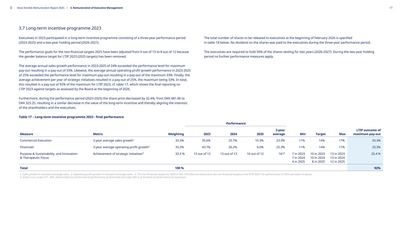 3.7 Long-term incentive programme 2023 Executives in 2023 participated in a long-term incentive programme consisting of a three-year performance period (2023-2025) and a two-year holding period (2026-2027). The performance goals for the non-financial targets 2025 have been adjusted from 9 out of 13 to 8 out of 12 because the gender balance target for LTIP 2023 (2025 targets) has been removed. The average annual sales growth performance in 2023-2025 of 24% exceeded the performance level for maximum pay-out resulting in a pay-out of 33%. Likewise, the average annual operating profit growth performance in 2023-2025 of 25% exceeded the performance level for maximum pay-out resulting in a pay-out of the maximum 33%. Finally, the average achievement per year of strategic initiatives resulted in a pay-out of 25%, the maximum being 33%. In total, this resulted in a pay-out of 92% of the maximum for LTIP 2023, cf. table 17, which shows the final reporting on LTIP 2023 against targets as assessed by the Board at the beginning of 2026. Furthermore, during the performance period (2023-2025) the share price decreased by 32.4%, from DKK 481.00 to DKK 325.25, resulting in a similar decrease in the value of the long-term incentive and thereby aligning the interests of the shareholders and the executives. Table 17 – Long-term incentive programme 2023 - final performance Performance LTIP outcome of maximum pay-outMeasure Metric Weighting 2023 2024 2025 3-year average Min Target Max Commercial Execution 3-year average sales growth1 33.3% 35.6% 25.7% 10.3% 23.9% 11% 14% 17% 33.3% Financials 3-year average operating profit growth2 33.3% 43.7% 26.2% 6.0% 25.3% 11% 14% 17% 33.3% Purpose & Sustainability, and Innovation & Therapeutic Focus Achievement of strategic initiatives3 33.3 % 12 out of 13 12 out of 13 10 out of 12 1614 7 in 2023 7 in 2024 4 in 2025 10 in 2023 10 in 2024 8 in 2025 13 in 2023 13 in 2024 12 in 2025 25.4 % Total 100 % 92% 1. Sales growth in constant exchange rates. 2. Operating profit growth in constant exchange rates. 3. The non-financial targets for 2025 in the LTIP 2023 are identical to the non-financial targets in the STIP 2025. For performance in 2025 see table 14 above. 4. Index is at a scale of 0 - 200, where index 0 is at the level of performance at threshold and index 200 is at the level of performance at maximum The total number of shares to be released to executives at the beginning of February 2026 is specified in table 18 below. No dividend on the shares was paid to the executives during the three-year performance period. The executives are required to hold 50% of the shares vesting for two years (2026-2027). During the two-year holding period no further performance measures apply. ––– Novo Nordisk Remuneration Report 2025 / 3. Remuneration of Executive Management 17