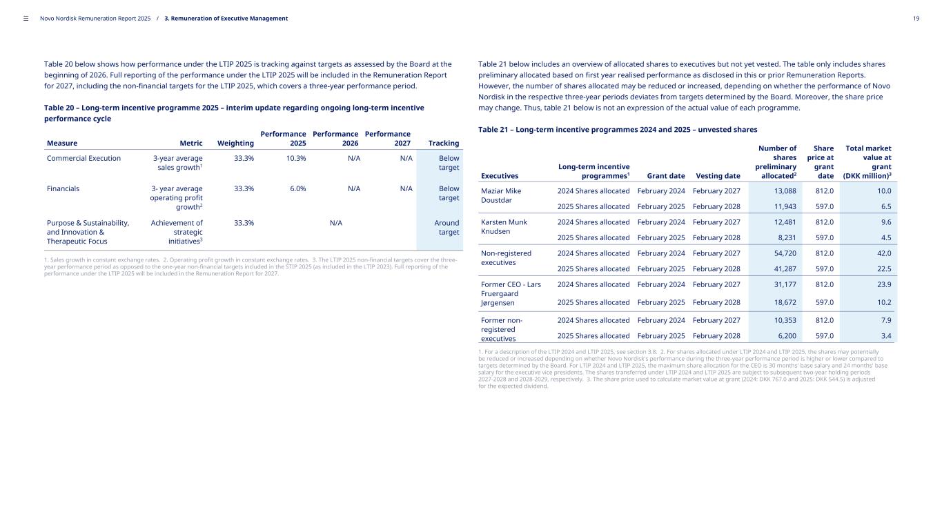 Table 20 below shows how performance under the LTIP 2025 is tracking against targets as assessed by the Board at the beginning of 2026. Full reporting of the performance under the LTIP 2025 will be included in the Remuneration Report for 2027, including the non-financial targets for the LTIP 2025, which covers a three-year performance period. Table 20 – Long-term incentive programme 2025 – interim update regarding ongoing long-term incentive performance cycle Measure Metric Weighting Performance 2025 Performance 2026 Performance 2027 Tracking Commercial Execution 3-year average sales growth1 33.3% 10.3% N/A N/A Below target Financials 3- year average operating profit growth2 33.3% 6.0% N/A N/A Below target Purpose & Sustainability, and Innovation & Therapeutic Focus Achievement of strategic initiatives3 33.3% N/A Around target 1. Sales growth in constant exchange rates. 2. Operating profit growth in constant exchange rates. 3. The LTIP 2025 non-financial targets cover the three- year performance period as opposed to the one-year non-financial targets included in the STIP 2025 (as included in the LTIP 2023). Full reporting of the performance under the LTIP 2025 will be included in the Remuneration Report for 2027. Table 21 below includes an overview of allocated shares to executives but not yet vested. The table only includes shares preliminary allocated based on first year realised performance as disclosed in this or prior Remuneration Reports. However, the number of shares allocated may be reduced or increased, depending on whether the performance of Novo Nordisk in the respective three-year periods deviates from targets determined by the Board. Moreover, the share price may change. Thus, table 21 below is not an expression of the actual value of each programme. Table 21 – Long-term incentive programmes 2024 and 2025 – unvested shares Executives Long-term incentive programmes1 Grant date Vesting date Number of shares preliminary allocated2 Share price at grant date Total market value at grant (DKK million)3 Maziar Mike Doustdar 2024 Shares allocated February 2024 February 2027 13,088 812.0 10.0 2025 Shares allocated February 2025 February 2028 11,943 597.0 6.5 Karsten Munk Knudsen 2024 Shares allocated February 2024 February 2027 12,481 812.0 9.6 2025 Shares allocated February 2025 February 2028 8,231 597.0 4.5 Non-registered executives 2024 Shares allocated February 2024 February 2027 54,720 812.0 42.0 2025 Shares allocated February 2025 February 2028 41,287 597.0 22.5 Former CEO - Lars Fruergaard Jørgensen 2024 Shares allocated February 2024 February 2027 31,177 812.0 23.9 2025 Shares allocated February 2025 February 2028 18,672 597.0 10.2 Former non- registered executives 2024 Shares allocated February 2024 February 2027 10,353 812.0 7.9 2025 Shares allocated February 2025 February 2028 6,200 597.0 3.4 1. For a description of the LTIP 2024 and LTIP 2025, see section 3.8. 2. For shares allocated under LTIP 2024 and LTIP 2025, the shares may potentially be reduced or increased depending on whether Novo Nordisk's performance during the three-year performance period is higher or lower compared to targets determined by the Board. For LTIP 2024 and LTIP 2025, the maximum share allocation for the CEO is 30 months' base salary and 24 months' base salary for the executive vice presidents. The shares transferred under LTIP 2024 and LTIP 2025 are subject to subsequent two-year holding periods 2027-2028 and 2028-2029, respectively. 3. The share price used to calculate market value at grant (2024: DKK 767.0 and 2025: DKK 544.5) is adjusted for the expected dividend. ––– Novo Nordisk Remuneration Report 2025 / 3. Remuneration of Executive Management 19