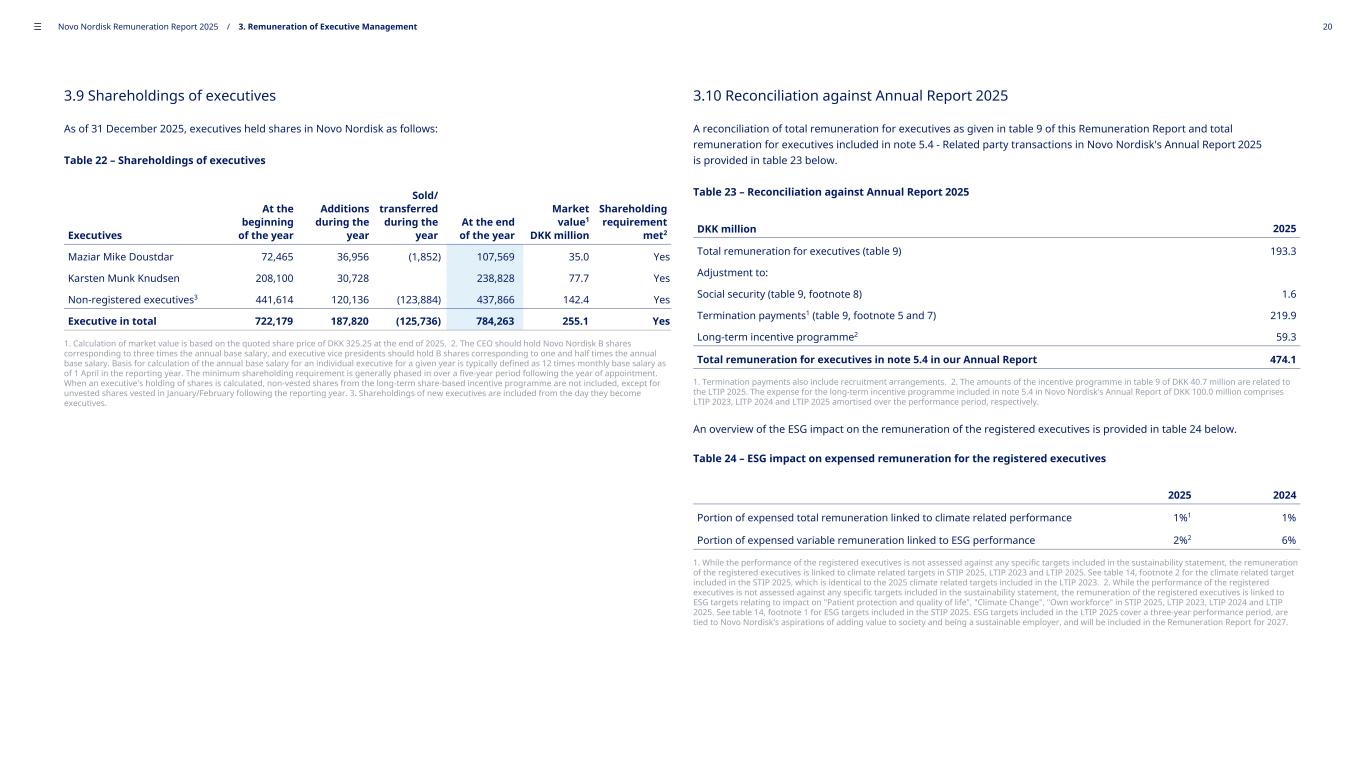 3.9 Shareholdings of executives As of 31 December 2025, executives held shares in Novo Nordisk as follows: Table 22 – Shareholdings of executives Executives At the beginning of the year Additions during the year Sold/ transferred during the year At the end of the year Market value1 DKK million Shareholding requirement met2 Maziar Mike Doustdar 72,465 36,956 (1,852) 107,569 35.0 Yes Karsten Munk Knudsen 208,100 30,728 238,828 77.7 Yes Non-registered executives3 441,614 120,136 (123,884) 437,866 142.4 Yes Executive in total 722,179 187,820 (125,736) 784,263 255.1 Yes 1. Calculation of market value is based on the quoted share price of DKK 325.25 at the end of 2025. 2. The CEO should hold Novo Nordisk B shares corresponding to three times the annual base salary, and executive vice presidents should hold B shares corresponding to one and half times the annual base salary. Basis for calculation of the annual base salary for an individual executive for a given year is typically defined as 12 times monthly base salary as of 1 April in the reporting year. The minimum shareholding requirement is generally phased in over a five-year period following the year of appointment. When an executive's holding of shares is calculated, non-vested shares from the long-term share-based incentive programme are not included, except for unvested shares vested in January/February following the reporting year. 3. Shareholdings of new executives are included from the day they become executives. 3.10 Reconciliation against Annual Report 2025 A reconciliation of total remuneration for executives as given in table 9 of this Remuneration Report and total remuneration for executives included in note 5.4 - Related party transactions in Novo Nordisk's Annual Report 2025 is provided in table 23 below. Table 23 – Reconciliation against Annual Report 2025 DKK million 2025 Total remuneration for executives (table 9) 193.3 Adjustment to: Social security (table 9, footnote 8) 1.6 Termination payments1 (table 9, footnote 5 and 7) 219.9 Long-term incentive programme2 59.3 Total remuneration for executives in note 5.4 in our Annual Report 474.1 1. Termination payments also include recruitment arrangements. 2. The amounts of the incentive programme in table 9 of DKK 40.7 million are related to the LTIP 2025. The expense for the long-term incentive programme included in note 5.4 in Novo Nordisk's Annual Report of DKK 100.0 million comprises LTIP 2023, LITP 2024 and LTIP 2025 amortised over the performance period, respectively. An overview of the ESG impact on the remuneration of the registered executives is provided in table 24 below. Table 24 – ESG impact on expensed remuneration for the registered executives 2025 2024 Portion of expensed total remuneration linked to climate related performance 1%1 1% Portion of expensed variable remuneration linked to ESG performance 2%2 6% 1. While the performance of the registered executives is not assessed against any specific targets included in the sustainability statement, the remuneration of the registered executives is linked to climate related targets in STIP 2025, LTIP 2023 and LTIP 2025. See table 14, footnote 2 for the climate related target included in the STIP 2025, which is identical to the 2025 climate related targets included in the LTIP 2023. 2. While the performance of the registered executives is not assessed against any specific targets included in the sustainability statement, the remuneration of the registered executives is linked to ESG targets relating to impact on "Patient protection and quality of life", "Climate Change", "Own workforce" in STIP 2025, LTIP 2023, LTIP 2024 and LTIP 2025. See table 14, footnote 1 for ESG targets included in the STIP 2025. ESG targets included in the LTIP 2025 cover a three-year performance period, are tied to Novo Nordisk's aspirations of adding value to society and being a sustainable employer, and will be included in the Remuneration Report for 2027. ––– Novo Nordisk Remuneration Report 2025 / 3. Remuneration of Executive Management 20