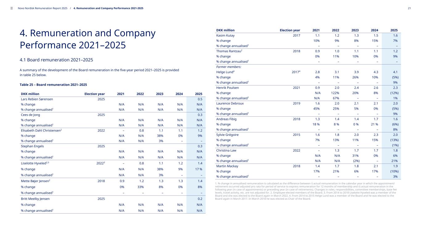 4. Remuneration and Company Performance 2021–2025 4.1 Board remuneration 2021–2025 A summary of the development of the Board remuneration in the five-year period 2021–2025 is provided in table 25 below. Table 25 – Board remuneration 2021–2025 DKK million Election year 2021 2022 2023 2024 2025 Lars Rebien Sørensen 2025 0.5 % change N/A N/A N/A N/A N/A % change annualised1 N/A N/A N/A N/A N/A Cees de Jong 2025 0.3 % change N/A N/A N/A N/A N/A % change annualised1 N/A N/A N/A N/A N/A Elisabeth Dahl Christensen2 2022 – 0.8 1.1 1.1 1.2 % change N/A N/A 38% 0% 9% % change annualised1 N/A N/A 3% – – Stephan Engels 2025 0.3 % change N/A N/A N/A N/A N/A % change annualised1 N/A N/A N/A N/A N/A Liselotte Hyveled2,3 20223 – 0.8 1.1 1.2 1.4 % change N/A N/A 38% 9% 17 % % change annualised1 N/A N/A 3% – – Mette Bøjer Jensen2 2018 0.9 1.2 1.3 1.3 1.4 % change 0% 33% 8% 0% 8% % change annualised1 – – – – – Britt Meelby Jensen 2025 0.2 % change N/A N/A N/A N/A N/A % change annualised1 N/A N/A N/A N/A N/A DKK million Election year 2021 2022 2023 2024 2025 Kasim Kutay 2017 1.1 1.2 1.3 1.5 1.6 % change 10% 9% 8% 15% 7% % change annualised1 – – – – – Thomas Rantzau2 2018 0.9 1.0 1.1 1.1 1.2 % change 0% 11% 10% 0% 9% % change annualised1 – – – – – Former members: Helge Lund4 20174 2.8 3.1 3.9 4.3 4.1 % change 4% 11% 26% 10% (5%) % change annualised1 – – – – 9% Henrik Poulsen 2021 0.9 2.0 2.4 2.6 2.3 % change N/A 122% 20% 8% (12%) % change annualised1 N/A 67% – – 1% Laurence Debroux 2019 1.6 2.0 2.1 2.1 2.0 % change 45% 25% 5% 0% (5%) % change annualised1 – – – – 9% Andreas Fibig 2018 1.3 1.4 1.4 1.7 1.6 % change 18 % 8 % 0 % 21 % (6%) % change annualised1 – – – – 8% Sylvie Grégoire 2015 1.6 1.8 2.0 2.3 2.0 % change 7% 13% 11% 15% (13%) % change annualised1 – – – – (1%) Christina Law 2022 – 1.3 1.7 1.7 1.8 % change N/A N/A 31% 0% 6% % change annualised1 N/A N/A (2%) – 21% Martin Mackay 2018 1.4 1.7 1.8 2.1 1.9 % change 17% 21% 6% 17% (10%) % change annualised1 – – – – 3% 1. % change in annualised remuneration is calculated as the difference between i) actual remuneration in the calendar year in which the appointment/ retirement occurred adjusted pro rata for period of service to express remuneration for 12 months of membership and ii) actual remuneration in the following year (in case of appointments) or preceding year (in case of retirements). Changes in roles, responsibilities, committee memberships, base fee levels, travel activity, etc. are not adjusted for. 2. Employee-elected members of the Board. 3. From 2014 to 2018 Liselotte Hyveled was a member of the Board and she was elected to the Board again in March 2022. 4. From 2014 to 2015 Helge Lund was a member of the Board and he was elected to the Board again in March 2017. In March 2018 he was elected as Chair of the Board. ––– Novo Nordisk Remuneration Report 2025 / 4. Remuneration and Company Performance 2021-2025 21