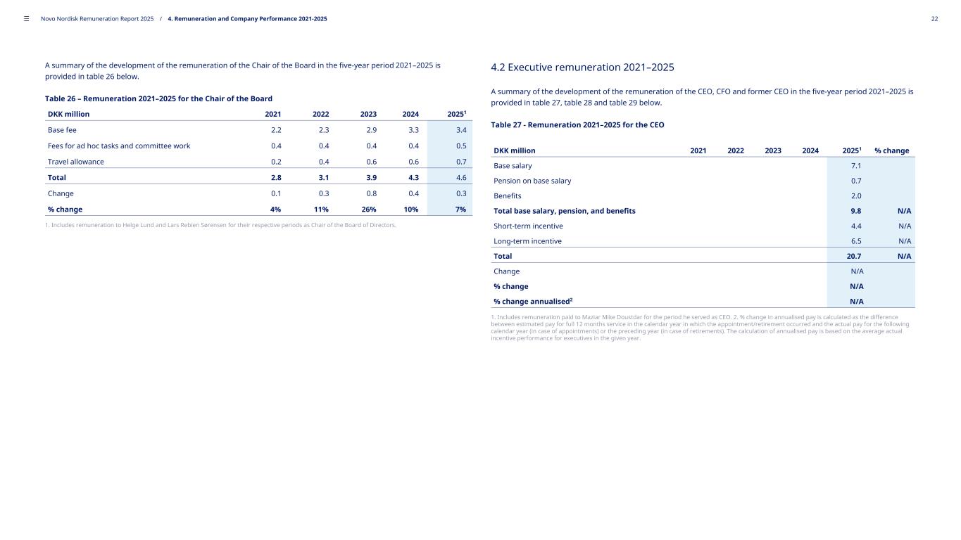 Table 28 - Remuneration 2021–2025 for the CFO DKK million 2021 2022 2023 20241 2025 % change Base salary 6.9 7.1 8.1 9.1 10.3 Pension on base salary 0.7 0.7 0.8 0.9 1.0 Benefits 0.3 0.3 0.3 0.4 0.3 Total base salary, pension, and benefits 7.9 8.1 9.2 10.4 11.6 12% Short-term incentive 4.1 4.7 6.1 6.8 2.6 (62%) Long-term incentive 8.4 8.7 11.1 9.6 4.5 (53%) Total 20.4 21.5 26.4 26.8 18.7 (30%) Change 0.7 1.1 4.9 0.4 (8.1) % change 4% 5% 23% 2% (30 %) % change annualised2 — — — — — 1. In 2024, the Annual General Meeting adopted a new Remuneration Policy applicable as of 2024, resulting in increased STIP opportunity for the executive vice presidents and increased LTIP opportunity for the CEO and executive vice presidents. 2. % change in annualised pay is calculated as the difference between estimated pay for full 12 months service in the calendar year in which the appointment/retirement occurred and the actual pay for the following calendar year (in case of appointments) or the preceding year (in case of retirements). The calculation of annualised pay is based on the average actual incentive performance for executives in the given year. Table 29 - Remuneration 2021–2025 for the former CEO1 DKK million 2021 2022 2023 20242 2025 % change Base salary 16.7 17.1 17.9 18.4 11.3 Pension on base salary 1.7 1.7 1.8 1.8 1.1 Benefits 0.3 0.3 0.3 0.3 0.2 Total base salary, pension, and benefits 18.7 19.1 20.0 20.5 12.6 (39%) Short-term incentive 12.6 13.2 17.2 12.7 3.5 (72%) Long-term incentive 27.0 27.8 31.0 23.9 6.1 (74%) Total 58.3 60.1 68.2 57.1 22.2 (61%) Change 1.8 1.8 8.1 (11.1) (34.9) % change 3% 3% 13% (16%) (61 %) % change annualised3 — — — — (35%) 1. Includes remuneration paid to Lars Fruergaard Jørgensen for the period he served as CEO. 2. In 2024, the Annual General Meeting adopted a new Remuneration Policy applicable as of 2024, resulting in increased STIP opportunity for the executive vice presidents and increased LTIP opportunity for the CEO and executive vice presidents. 3. % change in annualised pay is calculated as the difference between estimated pay for full 12 months service in the calendar year in which the appointment/retirement occurred and the actual pay for the following calendar year (in case of appointments) or the preceding year (in case of retirements). The calculation of annualised pay is based on the average actual incentive performance for executives in the given year. ––– Novo Nordisk Remuneration Report 2025 / 4. Remuneration and Company Performance 2021-2025 23