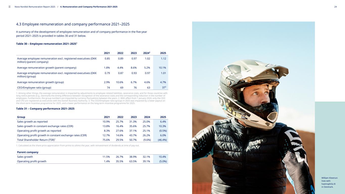 4.3 Employee remuneration and company performance 2021–2025 A summary of the development of employee remuneration and of company performance in the five-year period 2021–2025 is provided in tables 30 and 31 below. Table 30 – Employee remuneration 2021–20251 2021 2022 2023 20242 2025 Average employee remuneration excl. registered executives (DKK million) (parent company) 0.85 0.89 0.97 1.02 1.12 Average remuneration growth (parent company) 1.8% 4.4% 8.6% 5.2% 10.1% Average employee remuneration excl. registered executives (DKK million) (group) 0.79 0.87 0.93 0.97 1.01 Average remuneration growth (group) 2.9% 10.6% 6.7% 4.6% 4.7% CEO/Employee ratio (group) 74 69 76 63 373 1. Among other things, the average remuneration is impacted by adjustments to employee related liabilities, severance costs, and for those countries with long notice periods (e.g., Denmark) the timing difference between recognition of the severance costs and the corresponding reduction in the number of employees. Furthermore, the group numbers are impacted by currency fluctuations between the years. 2. With effect from 1 January 2024, only the CEO and CFO are registered as executives with the Danish Business Authority. 3. The CEO/Employee ratio (group) in 2025 was impacted by a lower payout on the short-term incentive programme for 2025, and a lower performance on the long-term incentive programme for 2025. Table 31 – Company performance 2021–2025 Group 2021 2022 2023 2024 2025 Sales growth as reported 10.9% 25.7% 31.3% 25.0% 6.4% Sales growth in constant exchange rates (CER) 13.8% 16.4% 35.6% 25.7% 10.3% Operating profit growth as reported 8.3% 27.6% 37.1% 25.1% (0.5%) Operating profit growth in constant exchange rates (CER) 12.7% 14.6% 43.7% 26.2% 6.0% Total Shareholder Return (TSR)1 75.6% 29.5% 50.7% (9.6%) (46.4%) 1. Calculated as the share price appreciation from primo to ultimo the year, with reinvestment of dividends at time of pay-out. Parent company Sales growth 11.5% 26.7% 38.9% 32.1% 10.4% Operating profit growth 1.4% 35.5% 63.5% 39.1% (5.0%) ––– Novo Nordisk Remuneration Report 2025 / 4. Remuneration and Company Performance 2021-2025 24