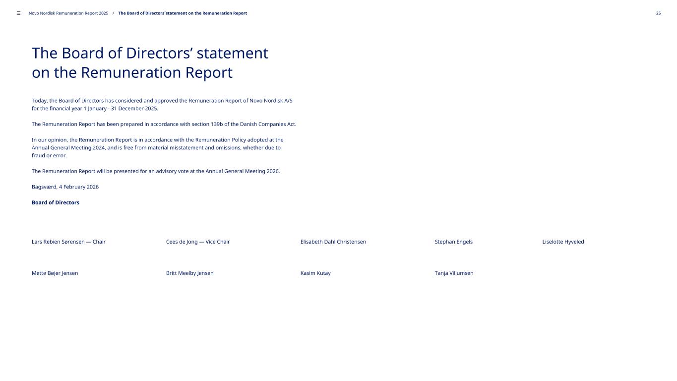 The Board of Directors’ statement on the Remuneration Report Today, the Board of Directors has considered and approved the Remuneration Report of Novo Nordisk A/S for the financial year 1 January - 31 December 2025. The Remuneration Report has been prepared in accordance with section 139b of the Danish Companies Act. In our opinion, the Remuneration Report is in accordance with the Remuneration Policy adopted at the Annual General Meeting 2024, and is free from material misstatement and omissions, whether due to fraud or error. The Remuneration Report will be presented for an advisory vote at the Annual General Meeting 2026. Bagsværd, 4 February 2026 Board of Directors Lars Rebien Sørensen — Chair Cees de Jong — Vice Chair Elisabeth Dahl Christensen Stephan Engels Liselotte Hyveled Mette Bøjer Jensen Britt Meelby Jensen Kasim Kutay Tanja Villumsen ––– Novo Nordisk Remuneration Report 2025 / The Board of Directors´statement on the Remuneration Report 25