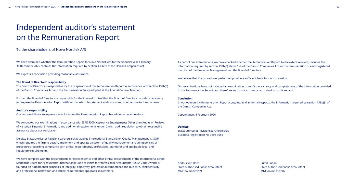 Independent auditor’s statement on the Remuneration Report To the shareholders of Novo Nordisk A/S We have examined whether the Remuneration Report for Novo Nordisk A/S for the financial year 1 January - 31 December 2025 contains the information required by section 139b(3) of the Danish Companies Act. We express a conclusion providing reasonable assurance. The Board of Directors' responsibility The Board of Directors is responsible for the preparation of the Remuneration Report in accordance with section 139b(3) of the Danish Companies Act and the Remuneration Policy adopted at the Annual General Meeting. Further, the Board of Directors is responsible for the internal control that the Board of Directors considers necessary to prepare the Remuneration Report without material misstatement and omissions, whether due to fraud or error. Auditor’s responsibility Our responsibility is to express a conclusion on the Remuneration Report based on our examinations. We conducted our examinations in accordance with ISAE 3000, Assurance Engagements Other than Audits or Reviews of Historical Financial Information, and additional requirements under Danish audit regulation to obtain reasonable assurance about our conclusion. Deloitte Statsautoriseret Revisionspartnerselskab applies International Standard on Quality Management 1, ISQM 1, which requires the firm to design, implement and operate a system of quality management including policies or procedures regarding compliance with ethical requirements, professional standards and applicable legal and regulatory requirements. We have complied with the requirements for independence and other ethical requirements of the International Ethics Standards Board for Accountants’ International Code of Ethics for Professional Accountants (IESBA Code), which is founded on fundamental principles of integrity, objectivity, professional competence and due care, confidentiality and professional behaviour, and ethical requirements applicable in Denmark. As part of our examinations, we have checked whether the Remuneration Report, to the extent relevant, includes the information required by section 139b(3), items 1-6, of the Danish Companies Act for the remuneration of each registered member of the Executive Management and the Board of Directors. We believe that the procedures performed provide a sufficient basis for our conclusion. Our examinations have not included an examination to verify the accuracy and completeness of the information provided in the Remuneration Report, and therefore we do not express any conclusion in this regard. Conclusion In our opinion the Remuneration Report contains, in all material respects, the information required by section 139b(3) of the Danish Companies Act. Copenhagen, 4 February 2026 Deloitte Statsautoriseret Revisionspartnerselskab Business Registration No 3396 3556 Anders Vad Dons Sumit Sudan State Authorised Public Accountant State Authorised Public Accountant MNE no mne25299 MNE no mne33716 ––– Novo Nordisk Remuneration Report 2025 / Independent auditor's statement on the Remuneration Report 26