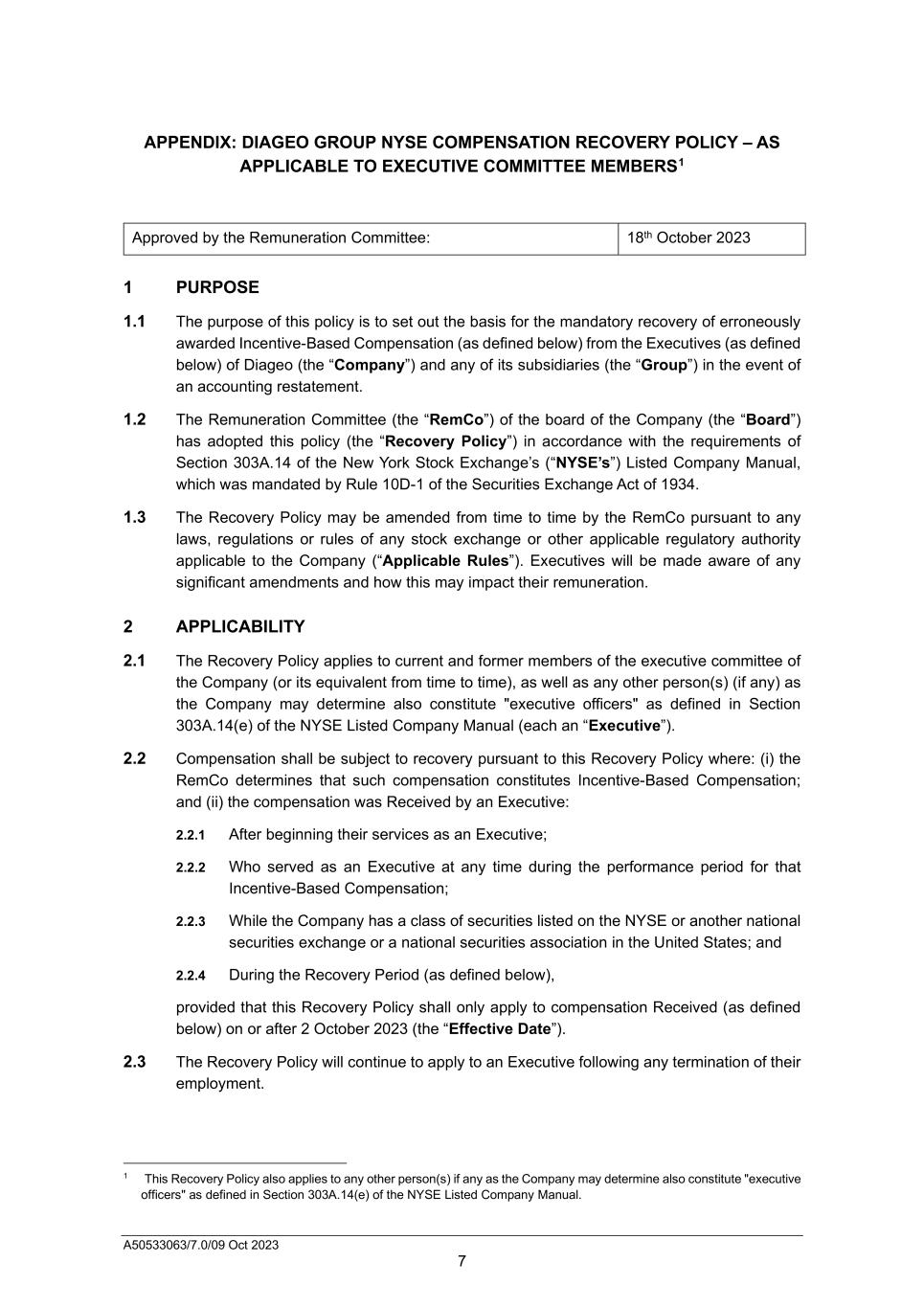 A50533063/7.0/09 Oct 2023 7 APPENDIX: DIAGEO GROUP NYSE COMPENSATION RECOVERY POLICY – AS APPLICABLE TO EXECUTIVE COMMITTEE MEMBERS1 Approved by the Remuneration Committee: 18th October 2023 1 PURPOSE 1.1 The purpose of this policy is to set out the basis for the mandatory recovery of erroneously awarded Incentive-Based Compensation (as defined below) from the Executives (as defined below) of Diageo (the “Company”) and any of its subsidiaries (the “Group”) in the event of an accounting restatement. 1.2 The Remuneration Committee (the “RemCo”) of the board of the Company (the “Board”) has adopted this policy (the “Recovery Policy”) in accordance with the requirements of Section 303A.14 of the New York Stock Exchange’s (“NYSE’s”) Listed Company Manual, which was mandated by Rule 10D-1 of the Securities Exchange Act of 1934. 1.3 The Recovery Policy may be amended from time to time by the RemCo pursuant to any laws, regulations or rules of any stock exchange or other applicable regulatory authority applicable to the Company (“Applicable Rules”). Executives will be made aware of any significant amendments and how this may impact their remuneration. 2 APPLICABILITY 2.1 The Recovery Policy applies to current and former members of the executive committee of the Company (or its equivalent from time to time), as well as any other person(s) (if any) as the Company may determine also constitute "executive officers" as defined in Section 303A.14(e) of the NYSE Listed Company Manual (each an “Executive”). 2.2 Compensation shall be subject to recovery pursuant to this Recovery Policy where: (i) the RemCo determines that such compensation constitutes Incentive-Based Compensation; and (ii) the compensation was Received by an Executive: 2.2.1 After beginning their services as an Executive; 2.2.2 Who served as an Executive at any time during the performance period for that Incentive-Based Compensation; 2.2.3 While the Company has a class of securities listed on the NYSE or another national securities exchange or a national securities association in the United States; and 2.2.4 During the Recovery Period (as defined below), provided that this Recovery Policy shall only apply to compensation Received (as defined below) on or after 2 October 2023 (the “Effective Date”). 2.3 The Recovery Policy will continue to apply to an Executive following any termination of their employment. 1 This Recovery Policy also applies to any other person(s) if any as the Company may determine also constitute "executive officers" as defined in Section 303A.14(e) of the NYSE Listed Company Manual.