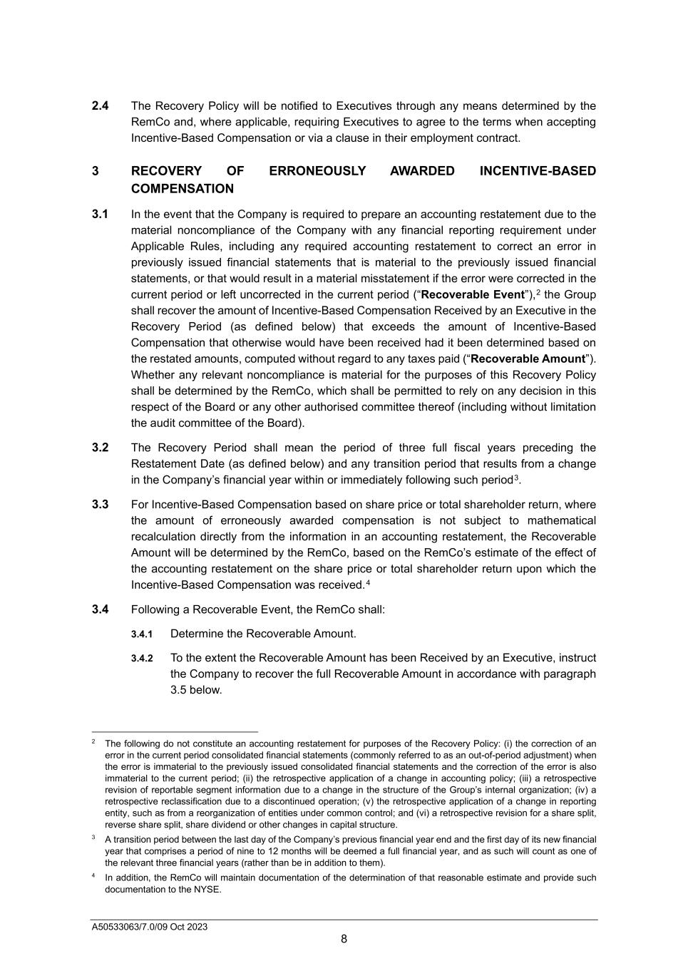 A50533063/7.0/09 Oct 2023 8 2.4 The Recovery Policy will be notified to Executives through any means determined by the RemCo and, where applicable, requiring Executives to agree to the terms when accepting Incentive-Based Compensation or via a clause in their employment contract. 3 RECOVERY OF ERRONEOUSLY AWARDED INCENTIVE-BASED COMPENSATION 3.1 In the event that the Company is required to prepare an accounting restatement due to the material noncompliance of the Company with any financial reporting requirement under Applicable Rules, including any required accounting restatement to correct an error in previously issued financial statements that is material to the previously issued financial statements, or that would result in a material misstatement if the error were corrected in the current period or left uncorrected in the current period (“Recoverable Event”),2 the Group shall recover the amount of Incentive-Based Compensation Received by an Executive in the Recovery Period (as defined below) that exceeds the amount of Incentive-Based Compensation that otherwise would have been received had it been determined based on the restated amounts, computed without regard to any taxes paid (“Recoverable Amount”). Whether any relevant noncompliance is material for the purposes of this Recovery Policy shall be determined by the RemCo, which shall be permitted to rely on any decision in this respect of the Board or any other authorised committee thereof (including without limitation the audit committee of the Board). 3.2 The Recovery Period shall mean the period of three full fiscal years preceding the Restatement Date (as defined below) and any transition period that results from a change in the Company’s financial year within or immediately following such period3. 3.3 For Incentive-Based Compensation based on share price or total shareholder return, where the amount of erroneously awarded compensation is not subject to mathematical recalculation directly from the information in an accounting restatement, the Recoverable Amount will be determined by the RemCo, based on the RemCo’s estimate of the effect of the accounting restatement on the share price or total shareholder return upon which the Incentive-Based Compensation was received.4 3.4 Following a Recoverable Event, the RemCo shall: 3.4.1 Determine the Recoverable Amount. 3.4.2 To the extent the Recoverable Amount has been Received by an Executive, instruct the Company to recover the full Recoverable Amount in accordance with paragraph 3.5 below. 2 The following do not constitute an accounting restatement for purposes of the Recovery Policy: (i) the correction of an error in the current period consolidated financial statements (commonly referred to as an out-of-period adjustment) when the error is immaterial to the previously issued consolidated financial statements and the correction of the error is also immaterial to the current period; (ii) the retrospective application of a change in accounting policy; (iii) a retrospective revision of reportable segment information due to a change in the structure of the Group’s internal organization; (iv) a retrospective reclassification due to a discontinued operation; (v) the retrospective application of a change in reporting entity, such as from a reorganization of entities under common control; and (vi) a retrospective revision for a share split, reverse share split, share dividend or other changes in capital structure. 3 A transition period between the last day of the Company’s previous financial year end and the first day of its new financial year that comprises a period of nine to 12 months will be deemed a full financial year, and as such will count as one of the relevant three financial years (rather than be in addition to them). 4 In addition, the RemCo will maintain documentation of the determination of that reasonable estimate and provide such documentation to the NYSE.