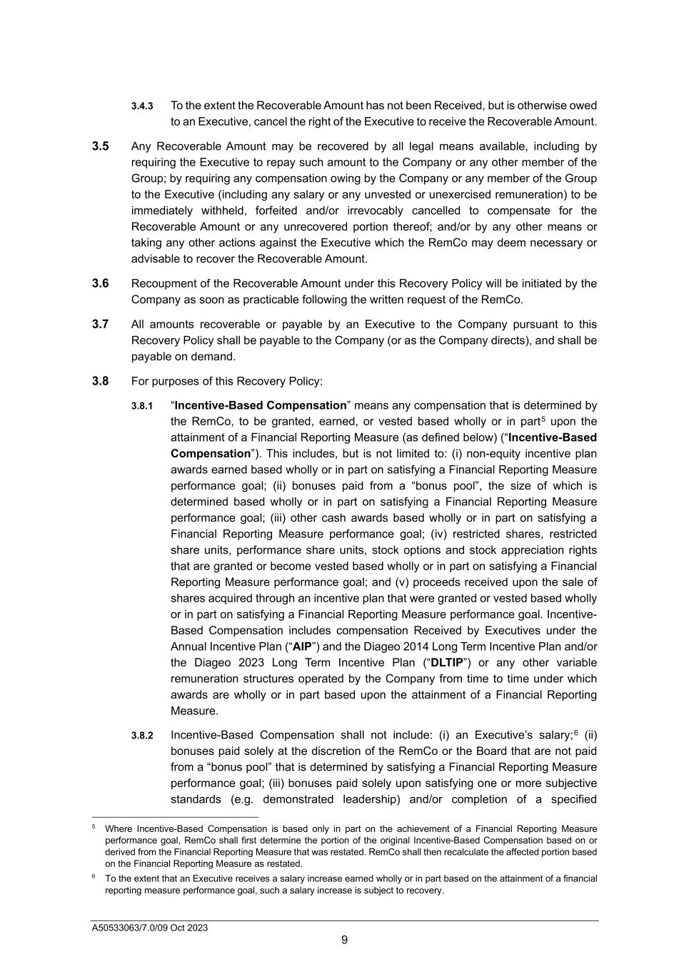 A50533063/7.0/09 Oct 2023 9 3.4.3 To the extent the Recoverable Amount has not been Received, but is otherwise owed to an Executive, cancel the right of the Executive to receive the Recoverable Amount. 3.5 Any Recoverable Amount may be recovered by all legal means available, including by requiring the Executive to repay such amount to the Company or any other member of the Group; by requiring any compensation owing by the Company or any member of the Group to the Executive (including any salary or any unvested or unexercised remuneration) to be immediately withheld, forfeited and/or irrevocably cancelled to compensate for the Recoverable Amount or any unrecovered portion thereof; and/or by any other means or taking any other actions against the Executive which the RemCo may deem necessary or advisable to recover the Recoverable Amount. 3.6 Recoupment of the Recoverable Amount under this Recovery Policy will be initiated by the Company as soon as practicable following the written request of the RemCo. 3.7 All amounts recoverable or payable by an Executive to the Company pursuant to this Recovery Policy shall be payable to the Company (or as the Company directs), and shall be payable on demand. 3.8 For purposes of this Recovery Policy: 3.8.1 “Incentive-Based Compensation” means any compensation that is determined by the RemCo, to be granted, earned, or vested based wholly or in part5 upon the attainment of a Financial Reporting Measure (as defined below) (“Incentive-Based Compensation”). This includes, but is not limited to: (i) non-equity incentive plan awards earned based wholly or in part on satisfying a Financial Reporting Measure performance goal; (ii) bonuses paid from a “bonus pool”, the size of which is determined based wholly or in part on satisfying a Financial Reporting Measure performance goal; (iii) other cash awards based wholly or in part on satisfying a Financial Reporting Measure performance goal; (iv) restricted shares, restricted share units, performance share units, stock options and stock appreciation rights that are granted or become vested based wholly or in part on satisfying a Financial Reporting Measure performance goal; and (v) proceeds received upon the sale of shares acquired through an incentive plan that were granted or vested based wholly or in part on satisfying a Financial Reporting Measure performance goal. Incentive- Based Compensation includes compensation Received by Executives under the Annual Incentive Plan (“AIP”) and the Diageo 2014 Long Term Incentive Plan and/or the Diageo 2023 Long Term Incentive Plan (“DLTIP”) or any other variable remuneration structures operated by the Company from time to time under which awards are wholly or in part based upon the attainment of a Financial Reporting Measure. 3.8.2 Incentive-Based Compensation shall not include: (i) an Executive’s salary;6 (ii) bonuses paid solely at the discretion of the RemCo or the Board that are not paid from a “bonus pool” that is determined by satisfying a Financial Reporting Measure performance goal; (iii) bonuses paid solely upon satisfying one or more subjective standards (e.g. demonstrated leadership) and/or completion of a specified 5 Where Incentive-Based Compensation is based only in part on the achievement of a Financial Reporting Measure performance goal, RemCo shall first determine the portion of the original Incentive-Based Compensation based on or derived from the Financial Reporting Measure that was restated. RemCo shall then recalculate the affected portion based on the Financial Reporting Measure as restated. 6 To the extent that an Executive receives a salary increase earned wholly or in part based on the attainment of a financial reporting measure performance goal, such a salary increase is subject to recovery.
