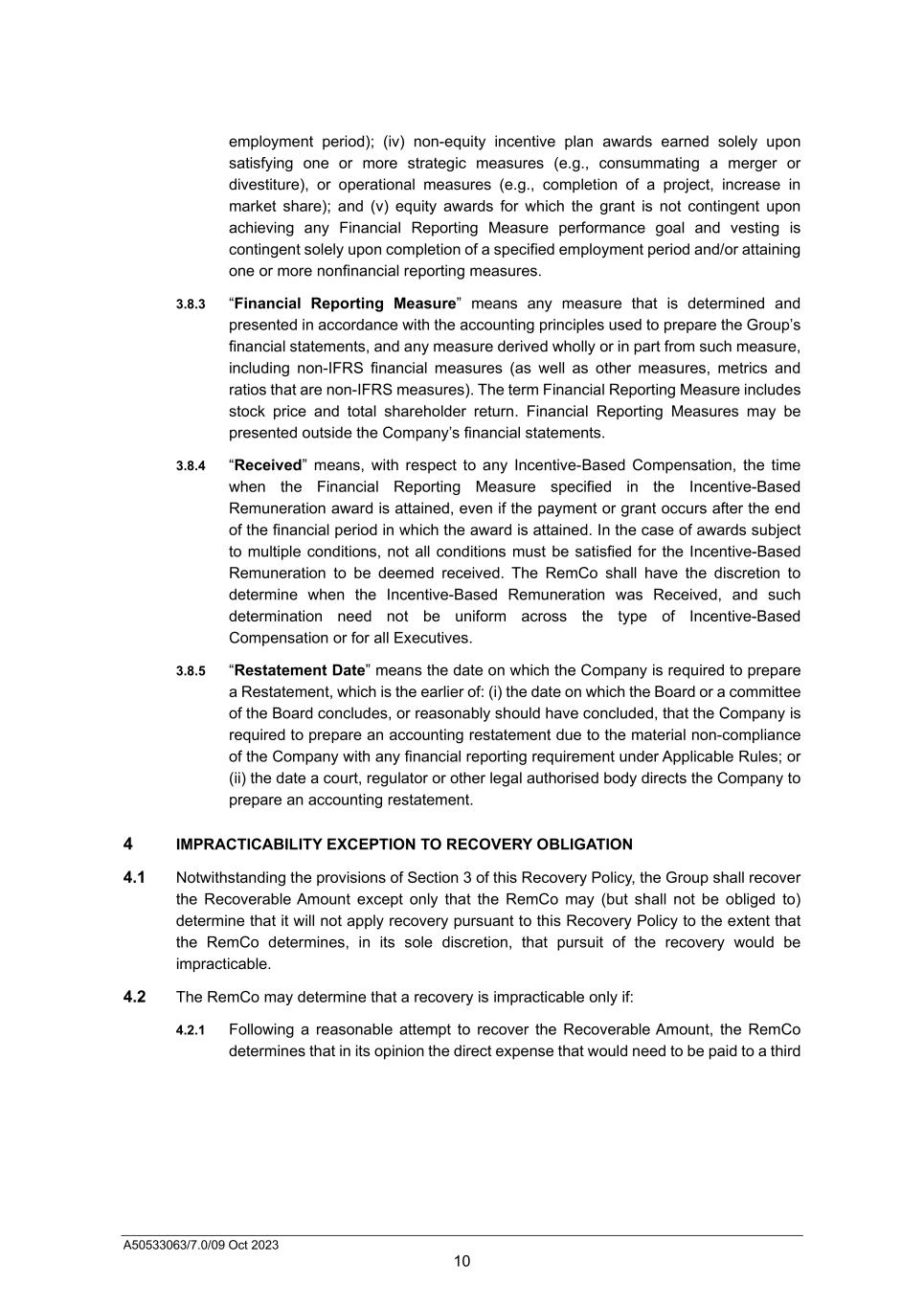 A50533063/7.0/09 Oct 2023 10 employment period); (iv) non-equity incentive plan awards earned solely upon satisfying one or more strategic measures (e.g., consummating a merger or divestiture), or operational measures (e.g., completion of a project, increase in market share); and (v) equity awards for which the grant is not contingent upon achieving any Financial Reporting Measure performance goal and vesting is contingent solely upon completion of a specified employment period and/or attaining one or more nonfinancial reporting measures. 3.8.3 “Financial Reporting Measure” means any measure that is determined and presented in accordance with the accounting principles used to prepare the Group’s financial statements, and any measure derived wholly or in part from such measure, including non-IFRS financial measures (as well as other measures, metrics and ratios that are non-IFRS measures). The term Financial Reporting Measure includes stock price and total shareholder return. Financial Reporting Measures may be presented outside the Company’s financial statements. 3.8.4 “Received” means, with respect to any Incentive-Based Compensation, the time when the Financial Reporting Measure specified in the Incentive-Based Remuneration award is attained, even if the payment or grant occurs after the end of the financial period in which the award is attained. In the case of awards subject to multiple conditions, not all conditions must be satisfied for the Incentive-Based Remuneration to be deemed received. The RemCo shall have the discretion to determine when the Incentive-Based Remuneration was Received, and such determination need not be uniform across the type of Incentive-Based Compensation or for all Executives. 3.8.5 “Restatement Date” means the date on which the Company is required to prepare a Restatement, which is the earlier of: (i) the date on which the Board or a committee of the Board concludes, or reasonably should have concluded, that the Company is required to prepare an accounting restatement due to the material non-compliance of the Company with any financial reporting requirement under Applicable Rules; or (ii) the date a court, regulator or other legal authorised body directs the Company to prepare an accounting restatement. 4 IMPRACTICABILITY EXCEPTION TO RECOVERY OBLIGATION 4.1 Notwithstanding the provisions of Section 3 of this Recovery Policy, the Group shall recover the Recoverable Amount except only that the RemCo may (but shall not be obliged to) determine that it will not apply recovery pursuant to this Recovery Policy to the extent that the RemCo determines, in its sole discretion, that pursuit of the recovery would be impracticable. 4.2 The RemCo may determine that a recovery is impracticable only if: 4.2.1 Following a reasonable attempt to recover the Recoverable Amount, the RemCo determines that in its opinion the direct expense that would need to be paid to a third