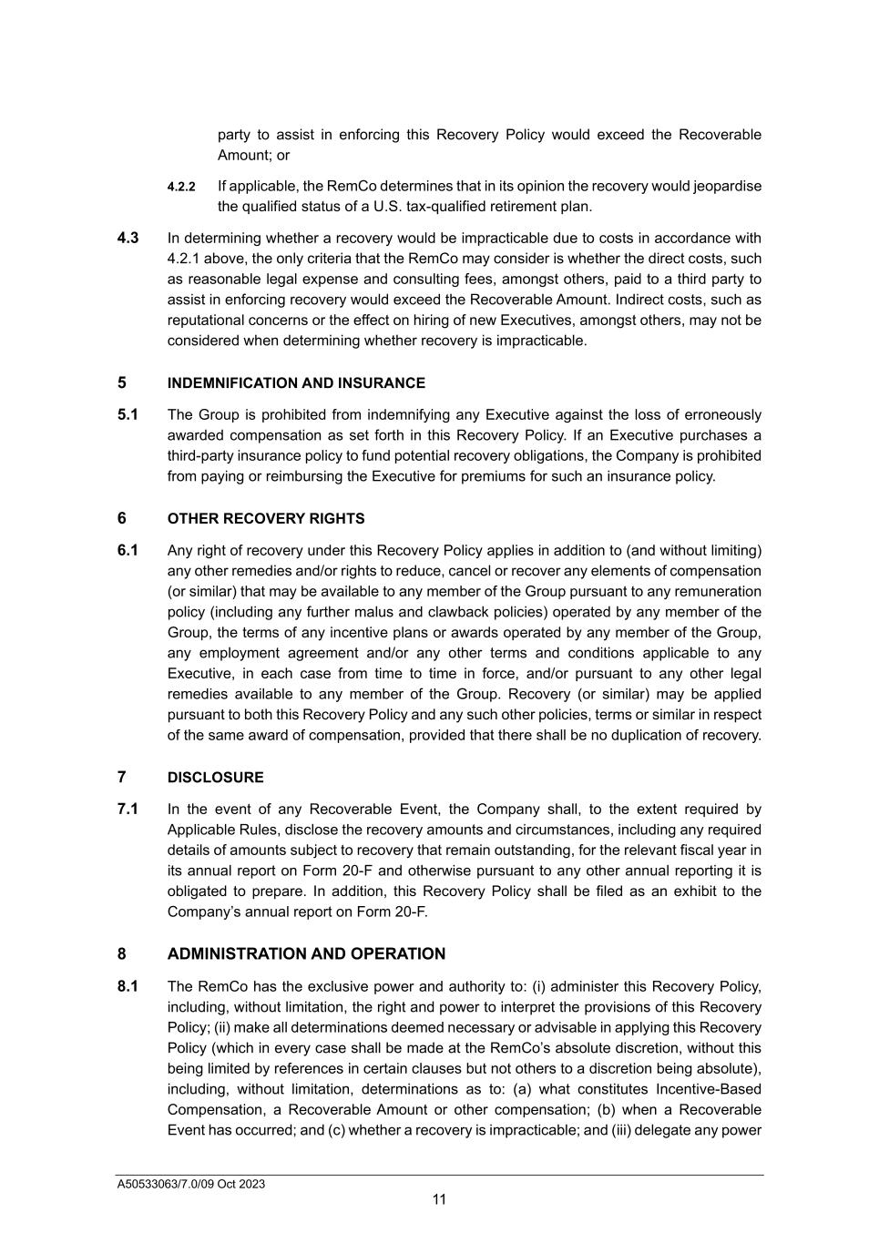 A50533063/7.0/09 Oct 2023 11 party to assist in enforcing this Recovery Policy would exceed the Recoverable Amount; or 4.2.2 If applicable, the RemCo determines that in its opinion the recovery would jeopardise the qualified status of a U.S. tax-qualified retirement plan. 4.3 In determining whether a recovery would be impracticable due to costs in accordance with 4.2.1 above, the only criteria that the RemCo may consider is whether the direct costs, such as reasonable legal expense and consulting fees, amongst others, paid to a third party to assist in enforcing recovery would exceed the Recoverable Amount. Indirect costs, such as reputational concerns or the effect on hiring of new Executives, amongst others, may not be considered when determining whether recovery is impracticable. 5 INDEMNIFICATION AND INSURANCE 5.1 The Group is prohibited from indemnifying any Executive against the loss of erroneously awarded compensation as set forth in this Recovery Policy. If an Executive purchases a third-party insurance policy to fund potential recovery obligations, the Company is prohibited from paying or reimbursing the Executive for premiums for such an insurance policy. 6 OTHER RECOVERY RIGHTS 6.1 Any right of recovery under this Recovery Policy applies in addition to (and without limiting) any other remedies and/or rights to reduce, cancel or recover any elements of compensation (or similar) that may be available to any member of the Group pursuant to any remuneration policy (including any further malus and clawback policies) operated by any member of the Group, the terms of any incentive plans or awards operated by any member of the Group, any employment agreement and/or any other terms and conditions applicable to any Executive, in each case from time to time in force, and/or pursuant to any other legal remedies available to any member of the Group. Recovery (or similar) may be applied pursuant to both this Recovery Policy and any such other policies, terms or similar in respect of the same award of compensation, provided that there shall be no duplication of recovery. 7 DISCLOSURE 7.1 In the event of any Recoverable Event, the Company shall, to the extent required by Applicable Rules, disclose the recovery amounts and circumstances, including any required details of amounts subject to recovery that remain outstanding, for the relevant fiscal year in its annual report on Form 20-F and otherwise pursuant to any other annual reporting it is obligated to prepare. In addition, this Recovery Policy shall be filed as an exhibit to the Company’s annual report on Form 20-F. 8 ADMINISTRATION AND OPERATION 8.1 The RemCo has the exclusive power and authority to: (i) administer this Recovery Policy, including, without limitation, the right and power to interpret the provisions of this Recovery Policy; (ii) make all determinations deemed necessary or advisable in applying this Recovery Policy (which in every case shall be made at the RemCo’s absolute discretion, without this being limited by references in certain clauses but not others to a discretion being absolute), including, without limitation, determinations as to: (a) what constitutes Incentive-Based Compensation, a Recoverable Amount or other compensation; (b) when a Recoverable Event has occurred; and (c) whether a recovery is impracticable; and (iii) delegate any power