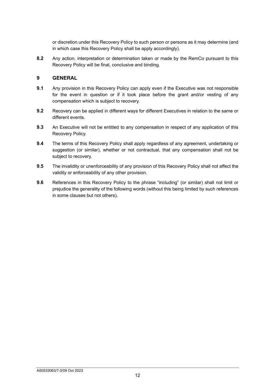 A50533063/7.0/09 Oct 2023 12 or discretion under this Recovery Policy to such person or persons as it may determine (and in which case this Recovery Policy shall be apply accordingly). 8.2 Any action, interpretation or determination taken or made by the RemCo pursuant to this Recovery Policy will be final, conclusive and binding. 9 GENERAL 9.1 Any provision in this Recovery Policy can apply even if the Executive was not responsible for the event in question or if it took place before the grant and/or vesting of any compensation which is subject to recovery. 9.2 Recovery can be applied in different ways for different Executives in relation to the same or different events. 9.3 An Executive will not be entitled to any compensation in respect of any application of this Recovery Policy. 9.4 The terms of this Recovery Policy shall apply regardless of any agreement, undertaking or suggestion (or similar), whether or not contractual, that any compensation shall not be subject to recovery. 9.5 The invalidity or unenforceability of any provision of this Recovery Policy shall not affect the validity or enforceability of any other provision. 9.6 References in this Recovery Policy to the phrase “including” (or similar) shall not limit or prejudice the generality of the following words (without this being limited by such references in some clauses but not others).
