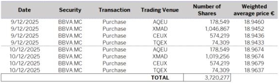 Likewise, BBVA informs that it has carried out the following transactions on its own shares in execution of the Buyback Program on December 9 and 10, 2025: