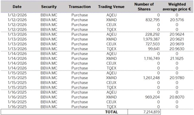 Further to the notice of inside information of 19 December 2025, with registration number 3046, relating to the execution of the first tranche of a buyback program of own shares of BBVA (the “First Tranche”), and pursuant to article 5 of Regulation (EU) no. 596/2014 of the European Parliament and of the Council of 16 April 2014 on market abuse, BBVA informs–on the basis of the information received from J.P. Morgan SE as the First Tranche manager– that it has carried out the following transactions over BBVA shares in execution of the First Tranche between 12 January and 16 January 2026 (both inclusive):