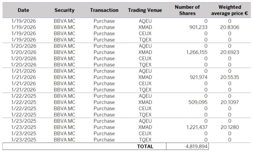 Further to the notice of inside information of 19 December 2025, with registration number 3046, relating to the execution of the first tranche of a buyback program of own shares of BBVA (the “First Tranche”), and pursuant to article 5 of Regulation (EU) no. 596/2014 of the European Parliament and of the Council of 16 April 2014 on market abuse, BBVA informs–on the basis of the information received from J.P. Morgan SE as the First Tranche manager– that it has carried out the following transactions over BBVA shares in execution of the First Tranche between 19 January and 23 January 2026 (both inclusive):