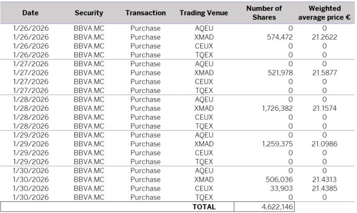 Further to the notice of inside information of 19 December 2025, with registration number 3046, relating to the execution of the first tranche of a buyback program of own shares of BBVA (the “First Tranche”), and pursuant to article 5 of Regulation (EU) no. 596/2014 of the European Parliament and of the Council of 16 April 2014 on market abuse, BBVA informs–on the basis of the information received from J.P. Morgan SE as the First Tranche manager– that it has carried out the following transactions over BBVA shares in execution of the First Tranche between 26 January and 30 January 2026 (both inclusive):