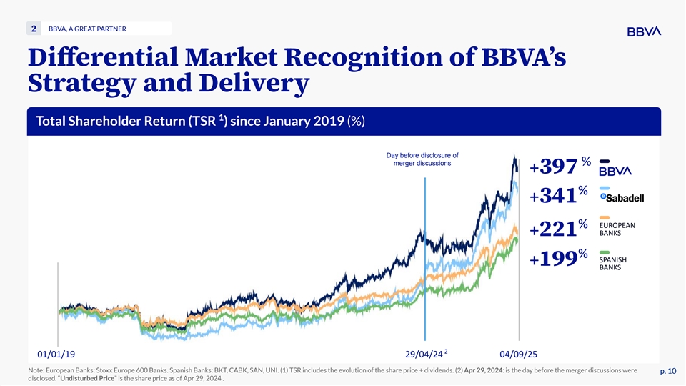 BBVA, A GREAT PARTNER 2 Differential Market Recognition of BBVAʼs Strategy and Delivery 1 Total Shareholder Return (TSR ) since January 2019 (%) Day before disclosure of merger discussions % +397 % +341 EUROPEAN % BANKS +221 % SPANISH +199 BANKS 2 01/01/19 29/04/24 04/09/25 Note: European Banks: Stoxx Europe 600 Banks. Spanish Banks: BKT, CABK, SAN, UNI. (1) TSR includes the evolution of the share price + dividends. (2) Apr 29, 2024: is the day before the merger discussions were p. 10 p. 10 disclosed. “Undisturbed Price” is the share price as of Apr 29, 2024 .