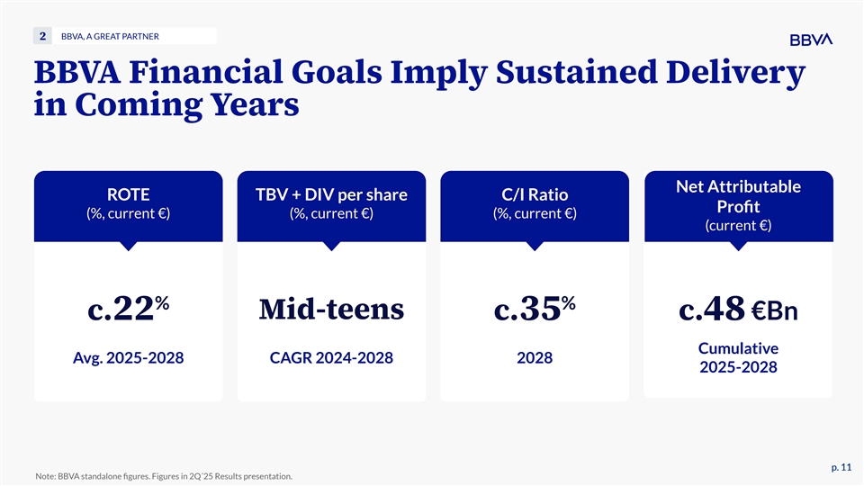 BBVA, A GREAT PARTNER 2 BBVA Financial Goals Imply Sustained Delivery in Coming Years Net Attributable ROTE TBV + DIV per share C/I Ratio Profit (%, current €) (%, current €) (%, current €) (current €) % % Mid-teens c.22 c.35 c.48 €Bn Cumulative Avg. 2025-2028 CAGR 2024-2028 2028 2025-2028 p. 11 p. 11 Note: BBVA standalone figures. Figures in 2Q´25 Results presentation.