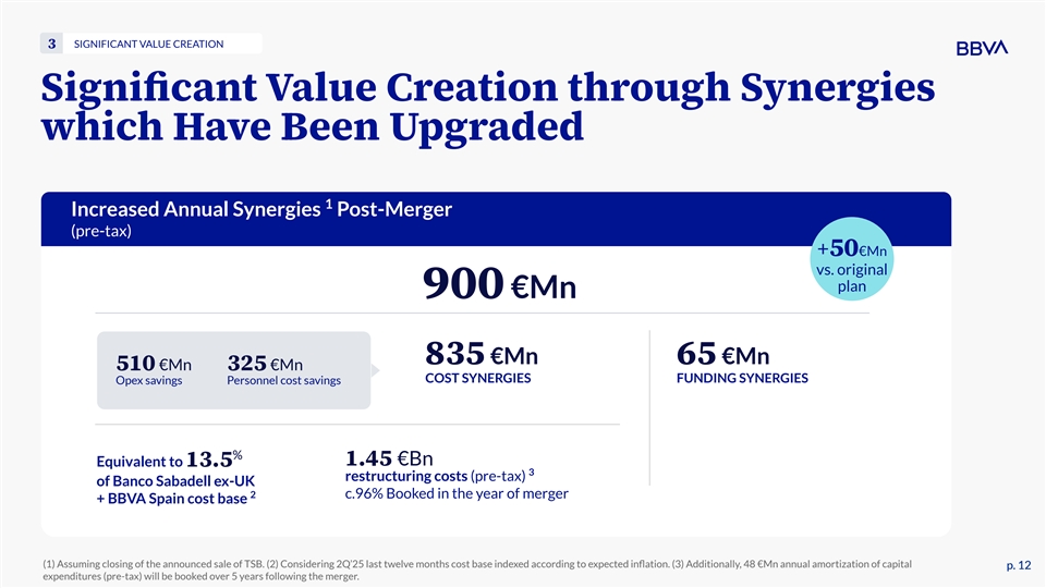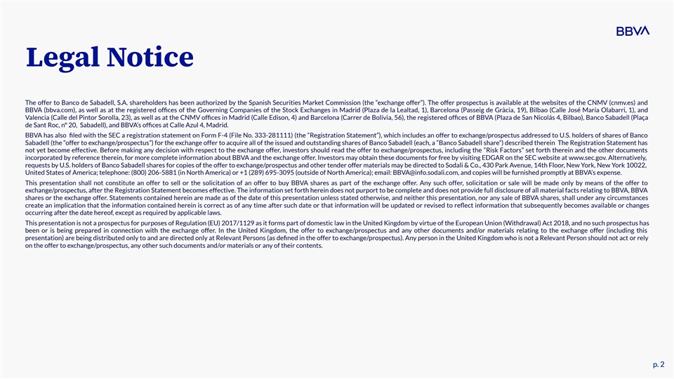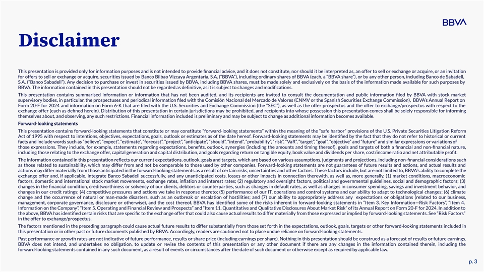 Legal Notice The offer to Banco de Sabadell, S.A. shareholders has been authorized by the Spanish Securities Market Commission (the “exchange offer”). The offer prospectus is available at the websites of the CNMV (cnmv.es) and BBVA (bbva.com), as well as at the registered offices of the Governing Companies of the Stock Exchanges in Madrid (Plaza de la Lealtad, 1), Barcelona (Passeig de Gràcia, 19), Bilbao (Calle José María Olabarri, 1), and Valencia (Calle del Pintor Sorolla, 23), as well as at the CNMV offices in Madrid (Calle Edison, 4) and Barcelona (Carrer de Bolívia, 56), the registered offices of BBVA (Plaza de San Nicolás 4, Bilbao), Banco Sabadell (Plaça de Sant Roc, nº 20, Sabadell), and BBVA’s offices at Calle Azul 4, Madrid. BBVA has also filed with the SEC a registration statement on Form F-4 (File No. 333-281111) (the “Registration Statement”), which includes an offer to exchange/prospectus addressed to U.S. holders of shares of Banco Sabadell (the “offer to exchange/prospectus”) for the exchange offer to acquire all of the issued and outstanding shares of Banco Sabadell (each, a “Banco Sabadell share”) described therein The Registration Statement has not yet become effective. Before making any decision with respect to the exchange offer, investors should read the offer to exchange/prospectus, including the “Risk Factors” set forth therein and the other documents incorporated by reference therein, for more complete information about BBVA and the exchange offer. Investors may obtain these documents for free by visiting EDGAR on the SEC website at www.sec.gov. Alternatively, requests by U.S. holders of Banco Sabadell shares for copies of the offer to exchange/prospectus and other tender offer materials may be directed to Sodali & Co., 430 Park Avenue, 14th Floor, New York, New York 10022, United States of America; telephone: (800) 206-5881 (in North America) or +1 (289) 695-3095 (outside of North America); email: BBVA@info.sodali.com, and copies will be furnished promptly at BBVA’s expense. This presentation shall not constitute an offer to sell or the solicitation of an offer to buy BBVA shares as part of the exchange offer. Any such offer, solicitation or sale will be made only by means of the offer to exchange/prospectus, after the Registration Statement becomes effective. The information set forth herein does not purport to be complete and does not provide full disclosure of all material facts relating to BBVA, BBVA shares or the exchange offer. Statements contained herein are made as of the date of this presentation unless stated otherwise, and neither this presentation, nor any sale of BBVA shares, shall under any circumstances create an implication that the information contained herein is correct as of any time after such date or that information will be updated or revised to reflect information that subsequently becomes available or changes occurring after the date hereof, except as required by applicable laws. This presentation is not a prospectus for purposes of Regulation (EU) 2017/1129 as it forms part of domestic law in the United Kingdom by virtue of the European Union (Withdrawal) Act 2018, and no such prospectus has been or is being prepared in connection with the exchange offer. In the United Kingdom, the offer to exchange/prospectus and any other documents and/or materials relating to the exchange offer (including this presentation) are being distributed only to and are directed only at Relevant Persons (as defined in the offer to exchange/prospectus). Any person in the United Kingdom who is not a Relevant Person should not act or rely on the offer to exchange/prospectus, any other such documents and/or materials or any of their contents. p. 2 p. 2