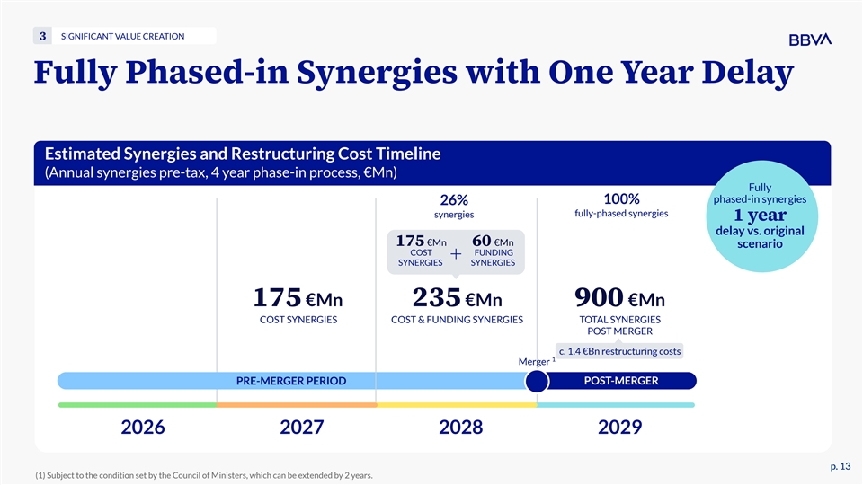 SIGNIFICANT VALUE CREATION 3 Fully Phased-in Synergies with One Year Delay Estimated Synergies and Restructuring Cost Timeline (Annual synergies pre-tax, 4 year phase-in process, €Mn) Fully phased-in synergies 26% 100% fully-phased synergies synergies 1 year delay vs. original 175 €Mn 60 €Mn scenario COST FUNDING SYNERGIES SYNERGIES 175 €Mn 235 €Mn 900 €Mn COST SYNERGIES COST & FUNDING SYNERGIES TOTAL SYNERGIES POST MERGER c. 1.4 €Bn restructuring costs 1 Merger PRE-MERGER PERIOD POST-MERGER 2026 2027 2028 2029 p. 13 p. 13 (1) Subject to the condition set by the Council of Ministers, which can be extended by 2 years.