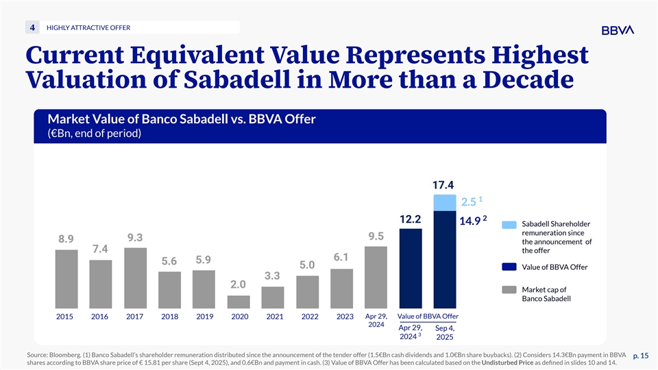 HIGHLY ATTRACTIVE OFFER 4 Current Equivalent Value Represents Highest Valuation of Sabadell in More than a Decade Market Value of Banco Sabadell vs. BBVA Offer (€Bn, end of period) 1 2.5 2 14.9 Sabadell Shareholder remuneration since the announcement of the offer Value of BBVA Offer Market cap of Banco Sabadell Apr 29, Value of BBVA Offer 2015 2016 2017 2018 2019 2020 2021 2022 2023 2024 Apr 29, Sep 4, 3 2024 2025 Source: Bloomberg. (1) Banco Sabadell’s shareholder remuneration distributed since the announcement of the tender offer (1.5€Bn cash dividends and 1.0€Bn share buybacks). (2) Considers 14.3€Bn payment in BBVA p. 15 p. 15 shares according to BBVA share price of € 15.81 per share (Sept 4, 2025), and 0.6€Bn and payment in cash. (3) Value of BBVA Offer has been calculated based on the Undisturbed Price as defined in slides 10 and 14.