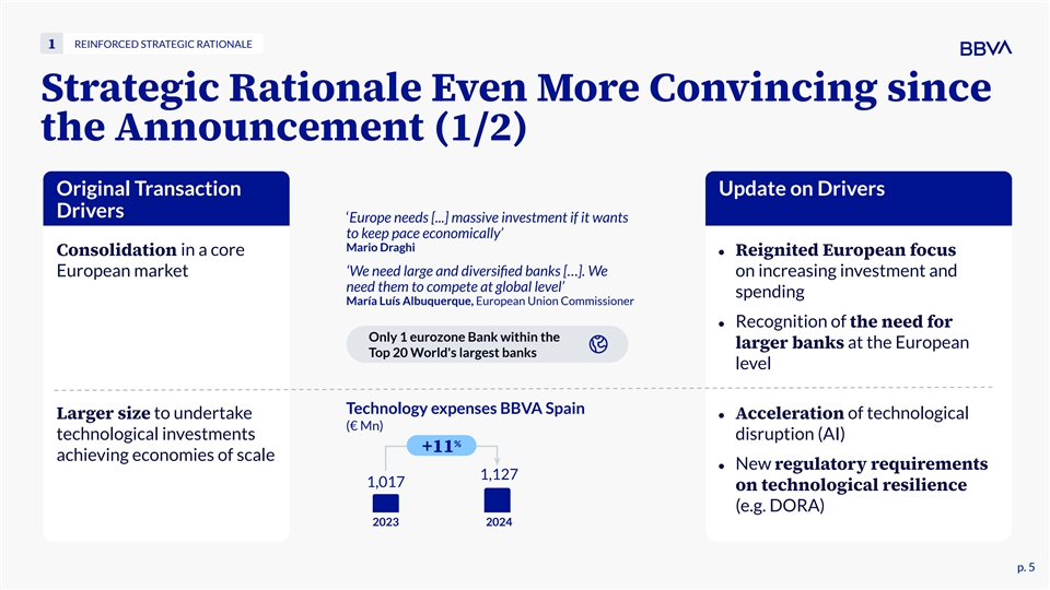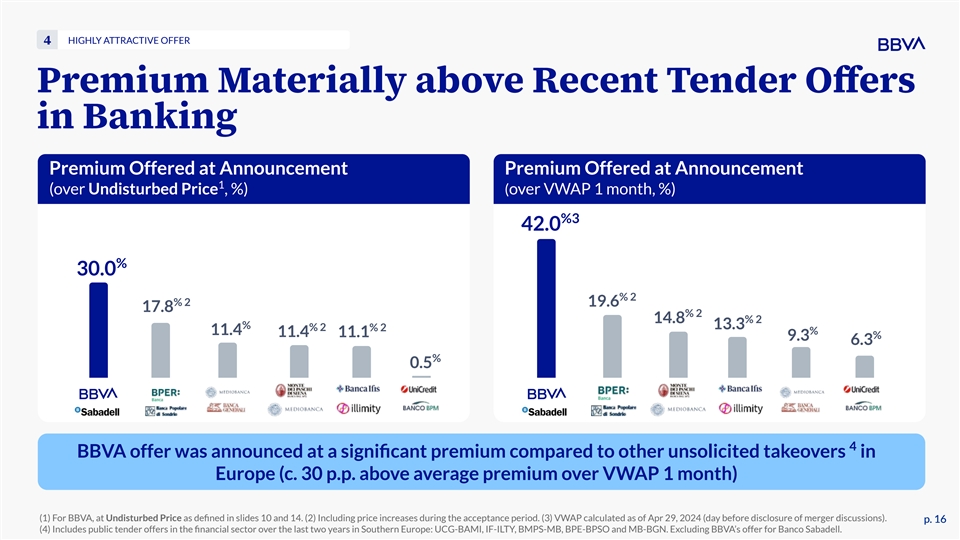 HIGHLY ATTRACTIVE OFFER 4 Premium Materially above Recent Tender Offers in Banking Premium Offered at Announcement Premium Offered at Announcement 1 (over Undisturbed Price , %) (over VWAP 1 month, %) %3 42.0 % 30.0 % 2 % 2 19.6 17.8 % 2 14.8 % 2 % 13.3 % 2 % 2 % 11.4 11.4 11.1 % 9.3 6.3 % 0.5 4 BBVA offer was announced at a significant premium compared to other unsolicited takeovers in Europe (c. 30 p.p. above average premium over VWAP 1 month) (1) For BBVA, at Undisturbed Price as defined in slides 10 and 14. (2) Including price increases during the acceptance period. (3) VWAP calculated as of Apr 29, 2024 (day before disclosure of merger discussions). p. 16 p. 16 (4) Includes public tender offers in the financial sector over the last two years in Southern Europe: UCG-BAMI, IF-ILTY, BMPS-MB, BPE-BPSO and MB-BGN. Excluding BBVA’s offer for Banco Sabadell.