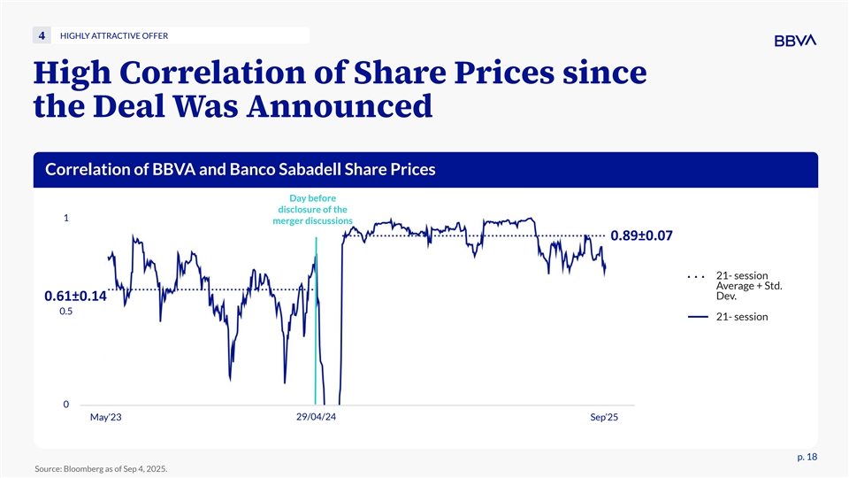 HIGHLY ATTRACTIVE OFFER 4 High Correlation of Share Prices since the Deal Was Announced Correlation of BBVA and Banco Sabadell Share Prices Day before disclosure of the 1 merger discussions 0.89±0.07 21- session Average + Std. Dev. 0.61±0.14 0.5 21- session 0 May’23 29/04/24 Sep’25 p. 18 Source: Bloomberg as of Sep 4, 2025.