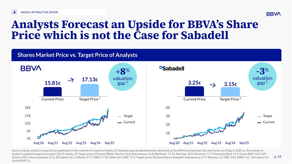 HIGHLY ATTRACTIVE OFFER 4 Analysts Forecast an Upside for BBVAʼs Share Price which is not the Case for Sabadell Shares Market Price vs. Target Price of Analysts % % -3 +8 valuation valuation 17.13€ 1 1 3.25€ gap 15.81€ gap 3.15€ 2 2 Current Price Target Price Current Price Target Price 18€ 4€ 14€ Target Target 3€ Current Current 10€ 2€ 6€ 1€ 2€ Aug’20 Aug’21 Aug’22 Aug’23 Aug’24 Sep’25 Aug’20 Aug’21 Aug’22 Aug’23 Aug’24 Sep’25 Source: Equity analyst’s target prices published on the website of respective banks (1) Valuation gap upside/downside calculated as the difference between the stock price as of Sep 4, 2025 vs. the median of analyst’s updated target prices post 2Q’25 results. (2) Target prices (€/share) BBVA: Alantra 16.0; Autonomous 16.8; Bankinter 17.45; Barclays 18.0; Bestinver 17.9; Deutsche Bank 15.9; Exane BNP 13.8; GVC p. 19 Gaesco 18.0; Intesa Sanpaolo 15.1; JB Capital 16.5; Jefferies 17.7; KBW 17.95; Oddo 16.0; RBC 17.5. Target prices (€/share) Banco Sabadell: Autonomous 2.71; Barclays 3.2; RBC 3.05; KBW 3.57; JB Capital 4.0; Exane BNP 3.1.