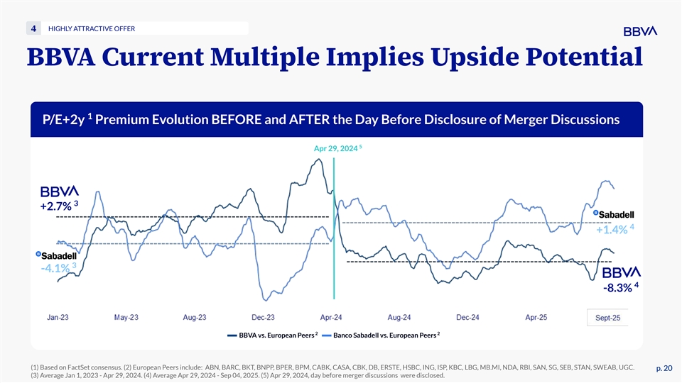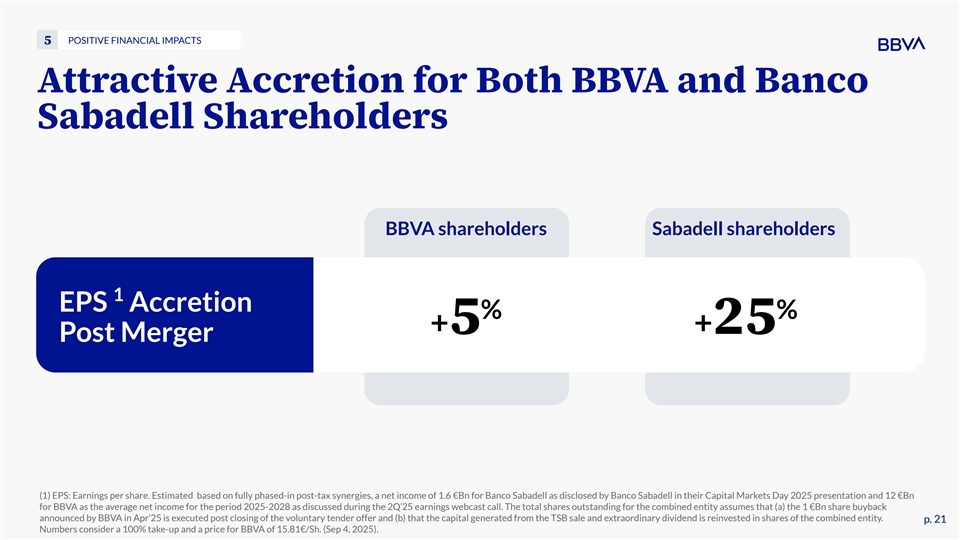 HIGHLY ATTRACTIVE OFFER 4 BBVA Current Multiple Implies Upside Potential 1 P/E+2y Premium Evolution BEFORE and AFTER the Day Before Disclosure of Merger Discussions 5 Apr 29, 2024 3 +2.7% 4 +1.4% 3 -4.1% 4 -8.3% 2 2 BBVA vs. European Peers Banco Sabadell vs. European Peers (1) Based on FactSet consensus. (2) European Peers include: ABN, BARC, BKT, BNPP, BPER, BPM, CABK, CASA, CBK, DB, ERSTE, HSBC, ING, ISP, KBC, LBG, MB.MI, NDA, RBI, SAN, SG, SEB, STAN, SWEAB, UGC. p. 20 p. 20 (3) Average Jan 1, 2023 - Apr 29, 2024. (4) Average Apr 29, 2024 - Sep 04, 2025. (5) Apr 29, 2024, day before merger discussions were disclosed.