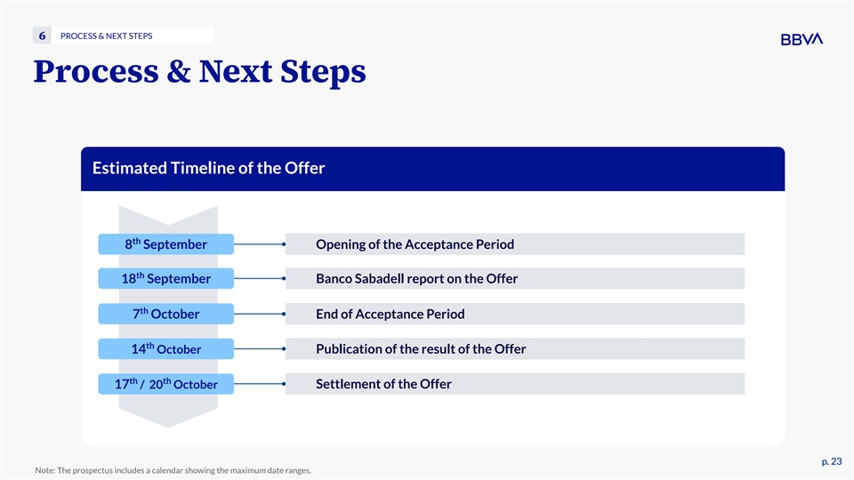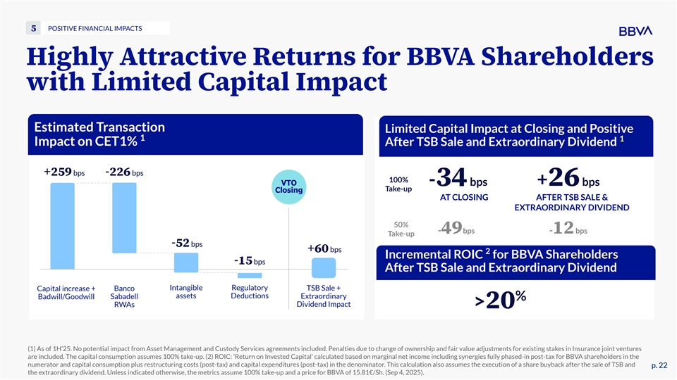 POSITIVE FINANCIAL IMPACTS 5 Highly Attractive Returns for BBVA Shareholders with Limited Capital Impact Estimated Transaction Limited Capital Impact at Closing and Positive 1 1 Impact on CET1% After TSB Sale and Extraordinary Dividend +259 bps -226 bps 100% VTO -34 bps +26 bps Take-up Closing AT CLOSING AFTER TSB SALE & EXTRAORDINARY DIVIDEND 50% -49 bps -12 bps Take-up -52 bps +60 bps 2 Incremental ROIC for BBVA Shareholders -15 bps After TSB Sale and Extraordinary Dividend Banco Intangible Regulatory TSB Sale + Capital increase + assets Deductions Badwill/Goodwill Sabadell Extraordinary % Dividend Impact RWAs >20 (1) As of 1H’25. No potential impact from Asset Management and Custody Services agreements included. Penalties due to change of ownership and fair value adjustments for existing stakes in Insurance joint ventures are included. The capital consumption assumes 100% take-up. (2) ROIC: 'Return on Invested Capital' calculated based on marginal net income including synergies fully phased-in post-tax for BBVA shareholders in the numerator and capital consumption plus restructuring costs (post-tax) and capital expenditures (post-tax) in the denominator. This calculation also assumes the execution of a share buyback after the sale of TSB and p. 22 p. 22 the extraordinary dividend. Unless indicated otherwise, the metrics assume 100% take-up and a price for BBVA of 15.81€/Sh. (Sep 4, 2025).