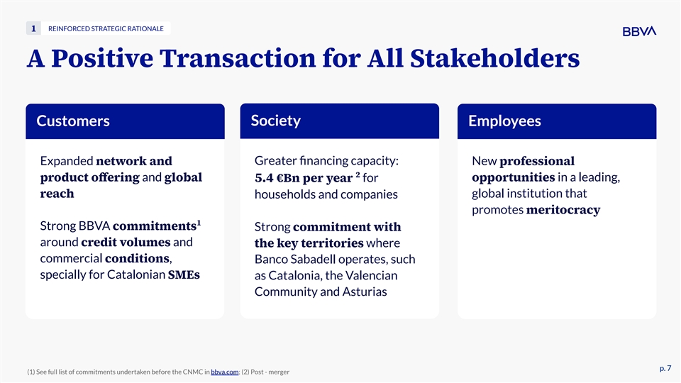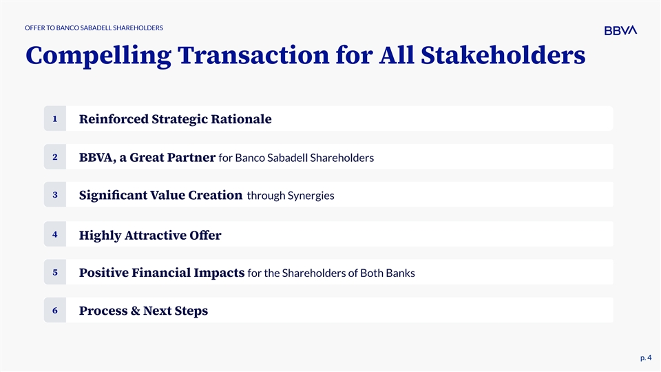 OFFER TO BANCO SABADELL SHAREHOLDERS Compelling Transaction for All Stakeholders 1 Reinforced Strategic Rationale 2 BBVA, a Great Partner for Banco Sabadell Shareholders 3 Significant Value Creation through Synergies 4 Highly Attractive Offer 5 Positive Financial Impacts for the Shareholders of Both Banks 6 Process & Next Steps p. 4 p. 4