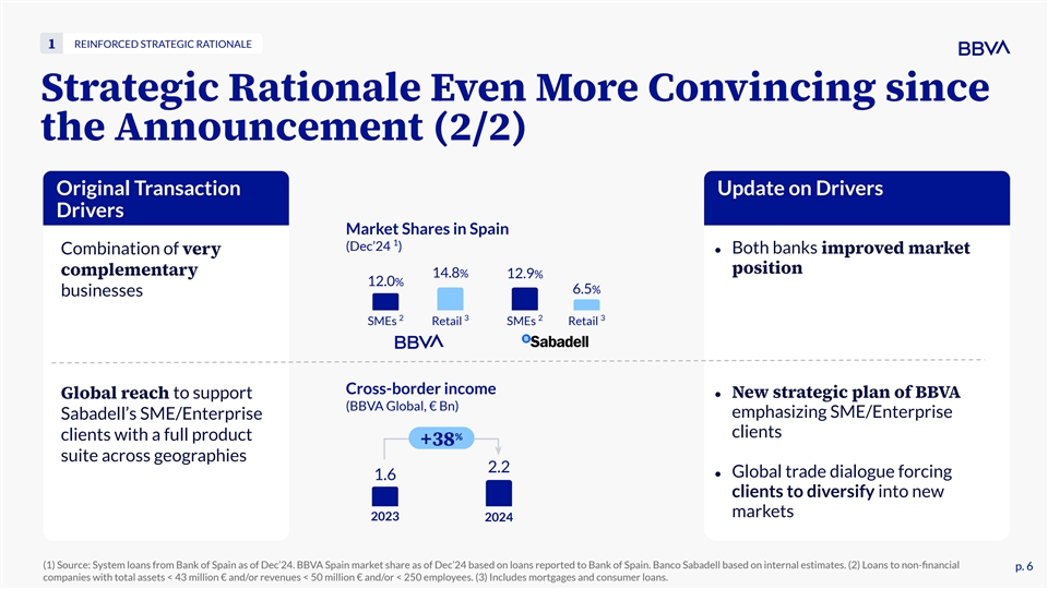 POSITIVE FINANCIAL IMPACTS 5 Attractive Accretion for Both BBVA and Banco Sabadell Shareholders BBVA shareholders Sabadell shareholders 1 EPS Accretion % % +5 +25 Post Merger (1) EPS: Earnings per share. Estimated based on fully phased-in post-tax synergies, a net income of 1.6 €Bn for Banco Sabadell as disclosed by Banco Sabadell in their Capital Markets Day 2025 presentation and 12 €Bn for BBVA as the average net income for the period 2025-2028 as discussed during the 2Q’25 earnings webcast call. The total shares outstanding for the combined entity assumes that (a) the 1 €Bn share buyback announced by BBVA in Apr’25 is executed post closing of the voluntary tender offer and (b) that the capital generated from the TSB sale and extraordinary dividend is reinvested in shares of the combined entity. p. 21 p. 21 Numbers consider a 100% take-up and a price for BBVA of 15.81€/Sh. (Sep 4, 2025).