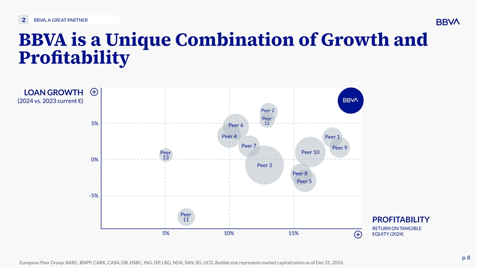 BBVA, A GREAT PARTNER 2 BBVA is a Unique Combination of Growth and Profitability LOAN GROWTH (2024 vs. 2023 current €) Peer 2 Peer 5% 12 Peer 6 Peer 4 Peer 1 Peer 7 Peer 9 Peer 10 Peer 13 0% Peer 3 Peer 8 Peer 5 -5% Peer 11 PROFITABILITY RETURN ON TANGIBLE 5% 10% 15% EQUITY (2024) p. 8 p. 8 European Peer Group: BARC, BNPP, CABK, CASA, DB, HSBC, ING, ISP, LBG, NDA, SAN, SG, UCG. Bubble size represents market capitalization as of Dec 31, 2024.