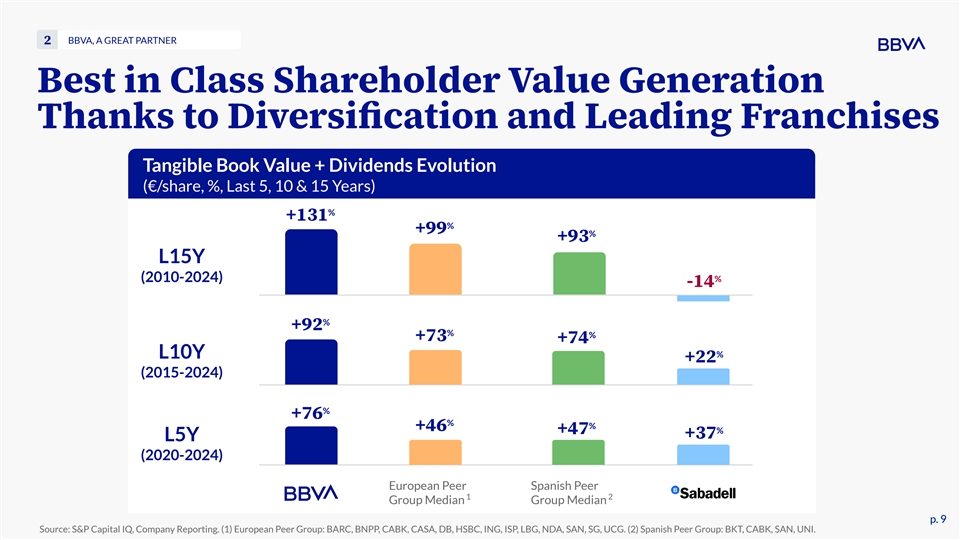 BBVA, A GREAT PARTNER 2 Best in Class Shareholder Value Generation Thanks to Diversification and Leading Franchises Tangible Book Value + Dividends Evolution (€/share, %, Last 5, 10 & 15 Years) % +131 % +99 % +93 L15Y (2010-2024) % -14 % +92 % % +73 +74 % L10Y +22 (2015-2024) % +76 % % +46 % +47 +37 L5Y (2020-2024) European Peer Spanish Peer 1 2 Group Median Group Median p. 9 p. 9 Source: S&P Capital IQ, Company Reporting. (1) European Peer Group: BARC, BNPP, CABK, CASA, DB, HSBC, ING, ISP, LBG, NDA, SAN, SG, UCG. (2) Spanish Peer Group: BKT, CABK, SAN, UNI.
