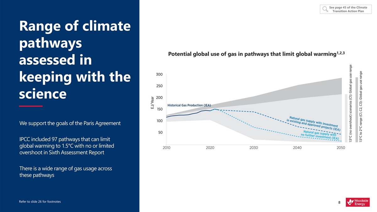 See page 45 of the Climate Transition Action Plan Range of climate pathways 1,2,3 Potential global use of gas in pathways that limit global warming assessed in keeping with the science We support the goals of the Paris Agreement IPCC included 97 pathways that can limit global warming to 1.5°C with no or limited overshoot in Sixth Assessment Report There is a wide range of gas usage across these pathways Refer to slide 26 for footnotes 8