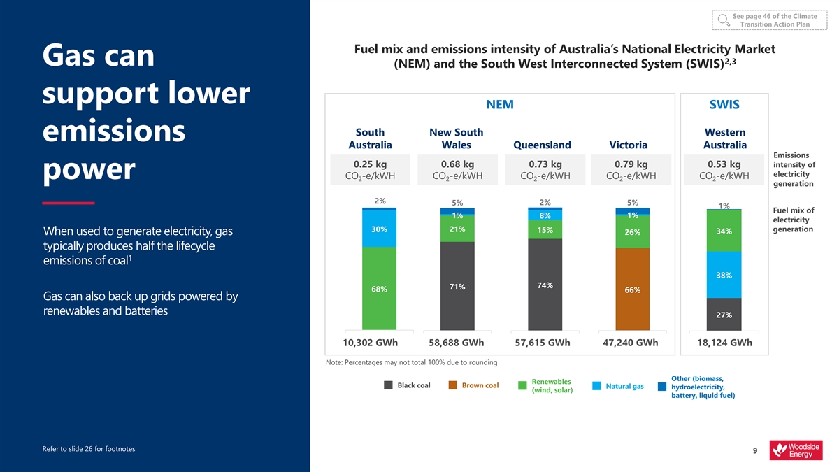 See page 46 of the Climate Transition Action Plan Fuel mix and emissions intensity of Australia’s National Electricity Market 2,3 Gas can (NEM) and the South West Interconnected System (SWIS) support lower NEM SWIS South New South Western emissions Australia Wales Queensland Victoria Australia Emissions 0.25 kg 0.68 kg 0.73 kg 0.79 kg 0.53 kg intensity of electricity power CO -e/kWH CO -e/kWH CO -e/kWH CO -e/kWH CO -e/kWH 2 2 2 2 2 generation 2% 5% 2% 5% 1% Fuel mix of 1% 8% 1% electricity 30% generation 21% 15% 34% When used to generate electricity, gas 26% typically produces half the lifecycle 1 emissions of coal 38% 74% 71% 68% 66% Gas can also back up grids powered by renewables and batteries 27% South Australia New South Wales Queensland Victoria 1 10,302 GWh 58,688 GWh 57,615 GWh 47,240 GWh 18,124 GWh Note: Percentages may not total 100% due to rounding Other (biomass, Renewables Black coal Brown coal Natural gas hydroelectricity, (wind, solar) battery, liquid fuel) Refer to slide 26 for footnotes 9