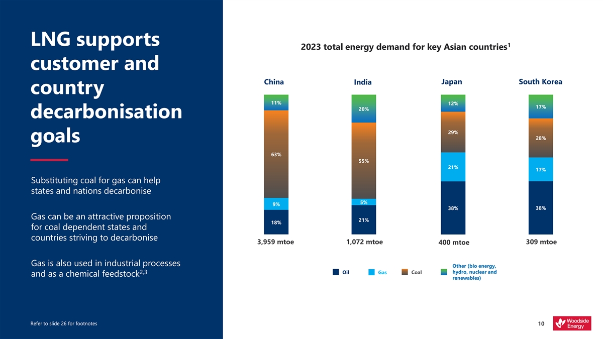 LNG supports 1 2023 total energy demand for key Asian countries customer and Japan South Korea China India country 11% 12% 17% 20% decarbonisation 29% 28% goals 63% 55% 21% 17% Substituting coal for gas can help states and nations decarbonise 5% 9% 38% 38% Gas can be an attractive proposition 21% 18% for coal dependent states and countries striving to decarbonise 3,959 mtoe 1,072 mtoe 309 mtoe 400 mtoe Gas is also used in industrial processes Other (bio energy, hydro, nuclear and 2,3 Oil Gas Coal and as a chemical feedstock renewables) Refer to slide 26 for footnotes 10