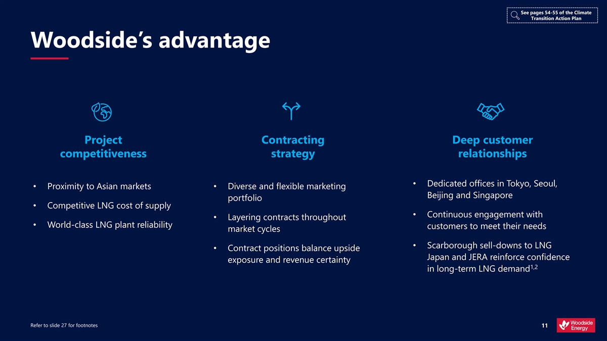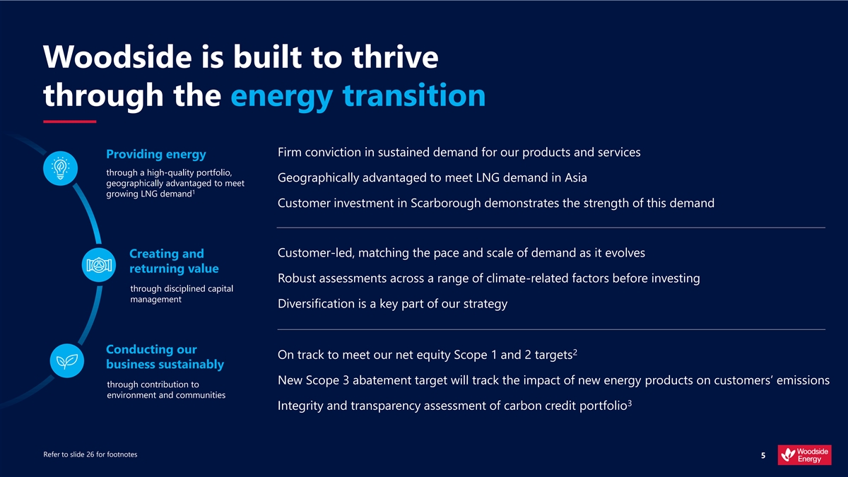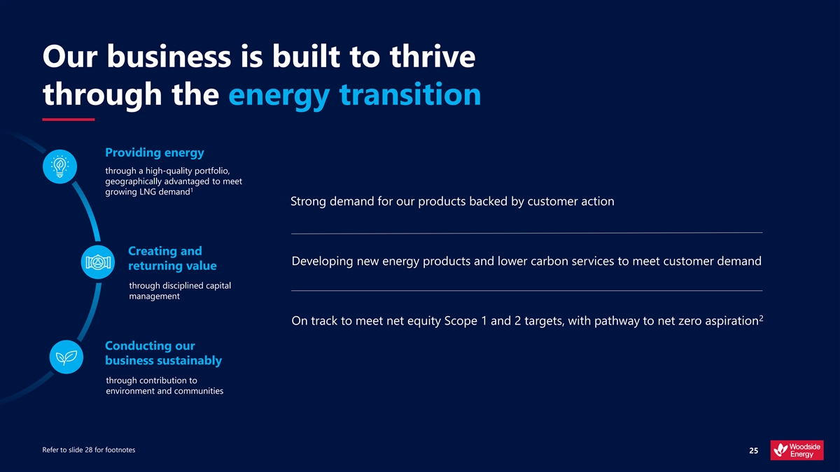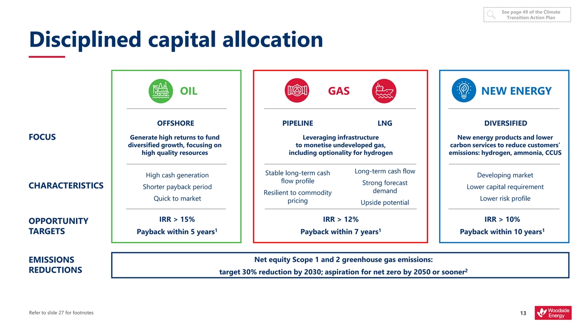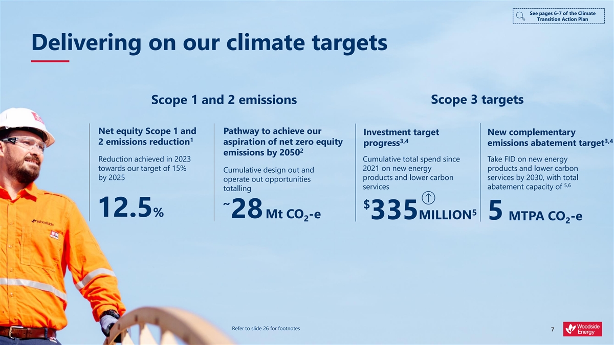 d e i f i s r e v i D t n e i l i s e R e l b a t See page 14 of the Climate Transition Action Plan Our strategy is designed Thrive through the energy transition for the energy transition CO 2 OPTIMISE VALUE AND SHAREHOLDER The world must There is no single or RETURNS decarbonise and the energy certain pathway through sector must respond the energy transition Woodside’s climate strategy is integrated throughout our company strategy Diversification and We are investing in products adaptation will be central to and services to create and Reduce our net equity Invest in products the competitiveness of return value through the Scope 1 and 2 greenhouse and services for the 2 gas emissions successful energy businesses energy transition energy transition Refer to slide 26 for footnotes 6 i f o r P 1 n o b r a C r e w o L t s o c w o L