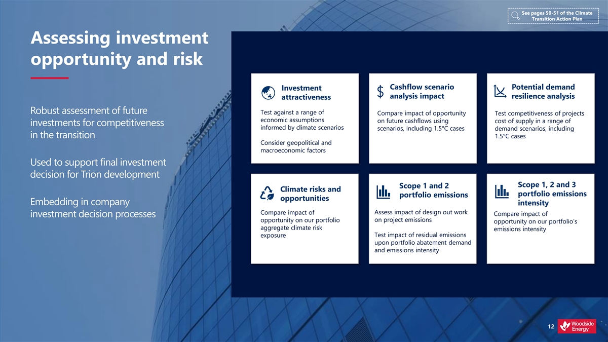 See pages 50-51 of the Climate Transition Action Plan Assessing investment opportunity and risk Cashflow scenario Potential demand Investment analysis impact resilience analysis attractiveness Robust assessment of future Test against a range of Compare impact of opportunity Test competitiveness of projects economic assumptions on future cashflows using cost of supply in a range of investments for competitiveness informed by climate scenarios scenarios, including 1.5°C cases demand scenarios, including in the transition 1.5°C cases Consider geopolitical and macroeconomic factors Used to support final investment decision for Trion development Scope 1, 2 and 3 Scope 1 and 2 Climate risks and portfolio emissions portfolio emissions opportunities Embedding in company intensity Assess impact of design out work Compare impact of Compare impact of investment decision processes on project emissions opportunity on our portfolio opportunity on our portfolio’s aggregate climate risk emissions intensity Test impact of residual emissions exposure upon portfolio abatement demand and emissions intensity 12