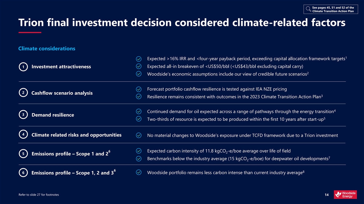See pages 45, 51 and 52 of the Climate Transition Action Plan Trion final investment decision considered climate-related factors Climate considerations 1 Expected >16% IRR and <four-year payback period, exceeding capital allocation framework targets Expected all-in breakeven of <US$50/bbl (<US$43/bbl excluding capital carry) 1 Investment attractiveness 2 Woodside’s economic assumptions include our view of credible future scenarios Forecast portfolio cashflow resilience is tested against IEA NZE pricing 2 Cashflow scenario analysis 3 Resilience remains consistent with outcomes in the 2023 Climate Transition Action Plan 4 Continued demand for oil expected across a range of pathways through the energy transition 3 Demand resilience 5 Two-thirds of resource is expected to be produced within the first 10 years after start-up 4 Climate related risks and opportunities No material changes to Woodside’s exposure under TCFD framework due to a Trion investment 6 Expected carbon intensity of 11.8 kgCO -e/boe average over life of field 2 5 Emissions profile – Scope 1 and 2 7 Benchmarks below the industry average (15 kgCO -e/boe) for deepwater oil developments 2 6 8 6 Woodside portfolio remains less carbon intense than current industry average Emissions profile – Scope 1, 2 and 3 Refer to slide 27 for footnotes 14