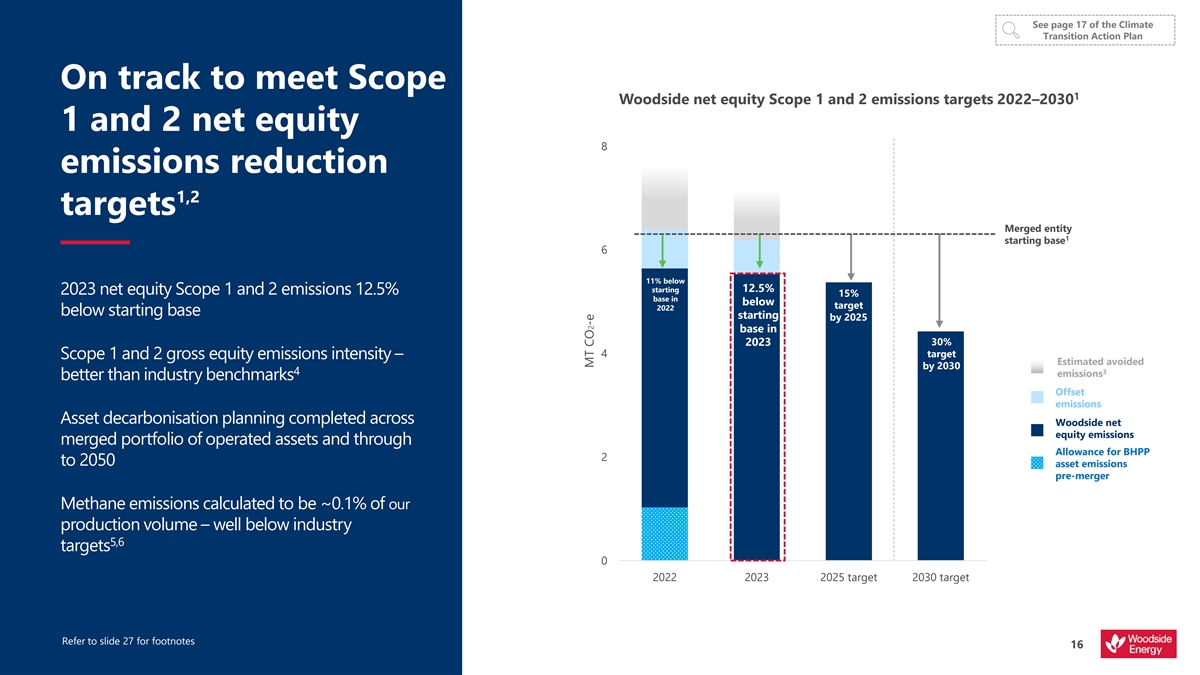 See page 17 of the Climate Transition Action Plan On track to meet Scope 1 Woodside net equity Scope 1 and 2 emissions targets 2022–2030 1 and 2 net equity 8 emissions reduction 1,2 targets Merged entity 1 starting base 6 11% below starting 12.5% 2023 net equity Scope 1 and 2 emissions 12.5% 15% base in below target 2022 below starting base starting by 2025 base in 30% 2023 4 target Scope 1 and 2 gross equity emissions intensity – Estimated avoided by 2030 3 4 emissions better than industry benchmarks Offset emissions Asset decarbonisation planning completed across Woodside net equity emissions merged portfolio of operated assets and through Allowance for BHPP 2 to 2050 asset emissions pre-merger Methane emissions calculated to be ~0.1% of our production volume – well below industry 5,6 targets 0 2022 2023 2025 target 2030 target Refer to slide 27 for footnotes 16 MT CO2-e